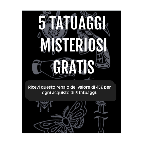 Quando acquisti 5 tatuaggi, riceverai un pacchetto con 5 tatuaggi aggiuntivi in omaggio. I 5 tatuaggi saranno selezionati dal nostro team in base ai tatuaggi da te ordinati per garantire che ti piacciano.