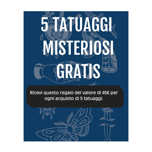 Quando acquisti 5 tatuaggi, riceverai un pacchetto con 5 tatuaggi aggiuntivi in omaggio. I 5 tatuaggi saranno selezionati dal nostro team in base ai tatuaggi da te ordinati per garantire che ti piacciano.