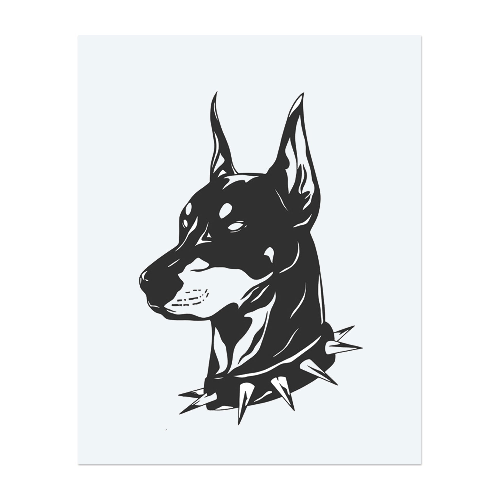 Una raffigurazione audace e ad alto contrasto di un dobermann con un collare chiodato, questo tatuaggio trasuda lealtà, vigilanza e un incrollabile spirito protettivo. Le sue linee nette e la postura eretta evocano una forza incrollabile e un vigile spirito protettivo.