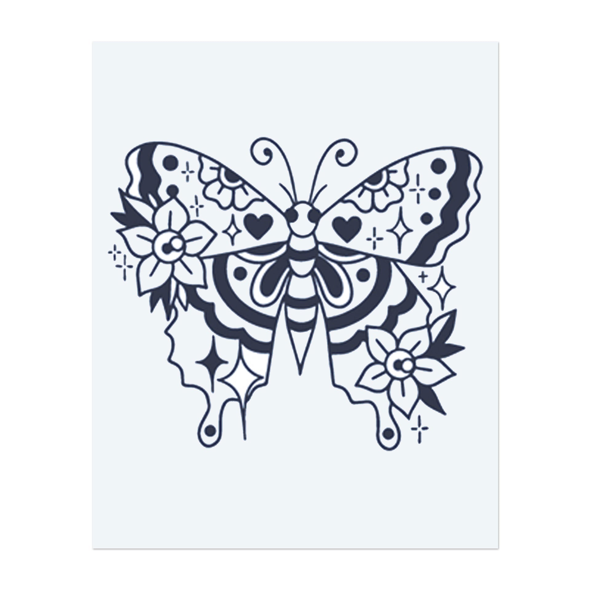 Una delicata farfalla con motivi a cuore sulle ali, circondata da fiori e dettagli scintillanti. Questo design simboleggia trasformazione, bellezza e amore, collegando la natura a un senso di magia e meraviglia.