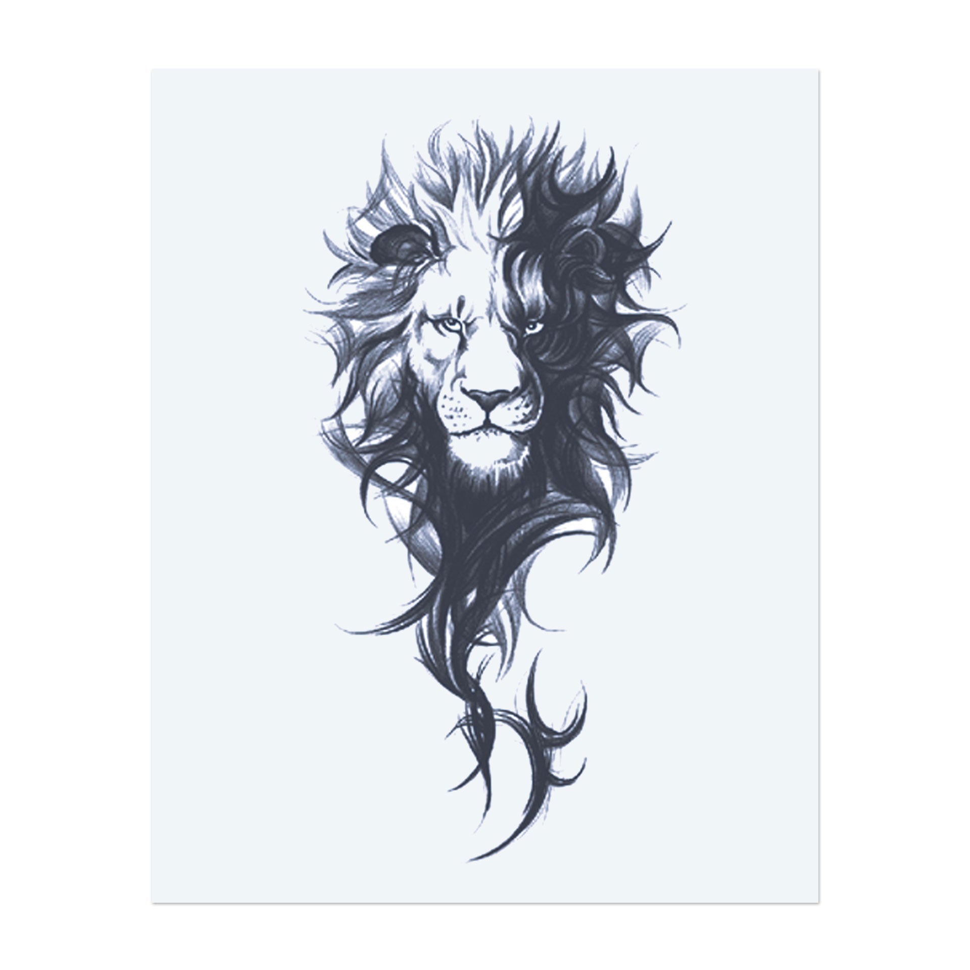Un leone bianco e nero con una fluente criniera fiammeggiante appare calmo e forte. Questo tatuaggio realistico rivela i lati chiari e scuri del leone, pronto a proteggere con coraggio e potere silenzioso.