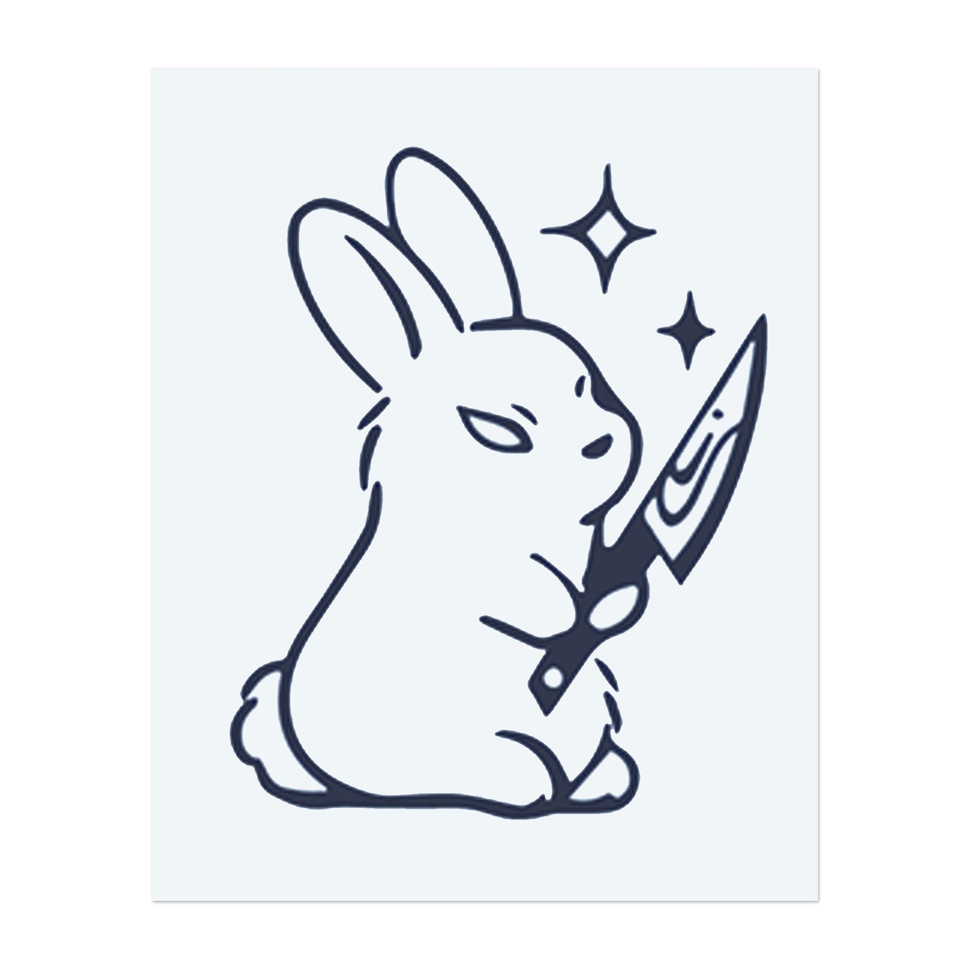 Un coniglio che impugna un coltello, circondato da stelle. Simboleggia un pericolo inaspettato, un giocoso tocco di violenza o un simbolo di dualità.