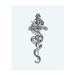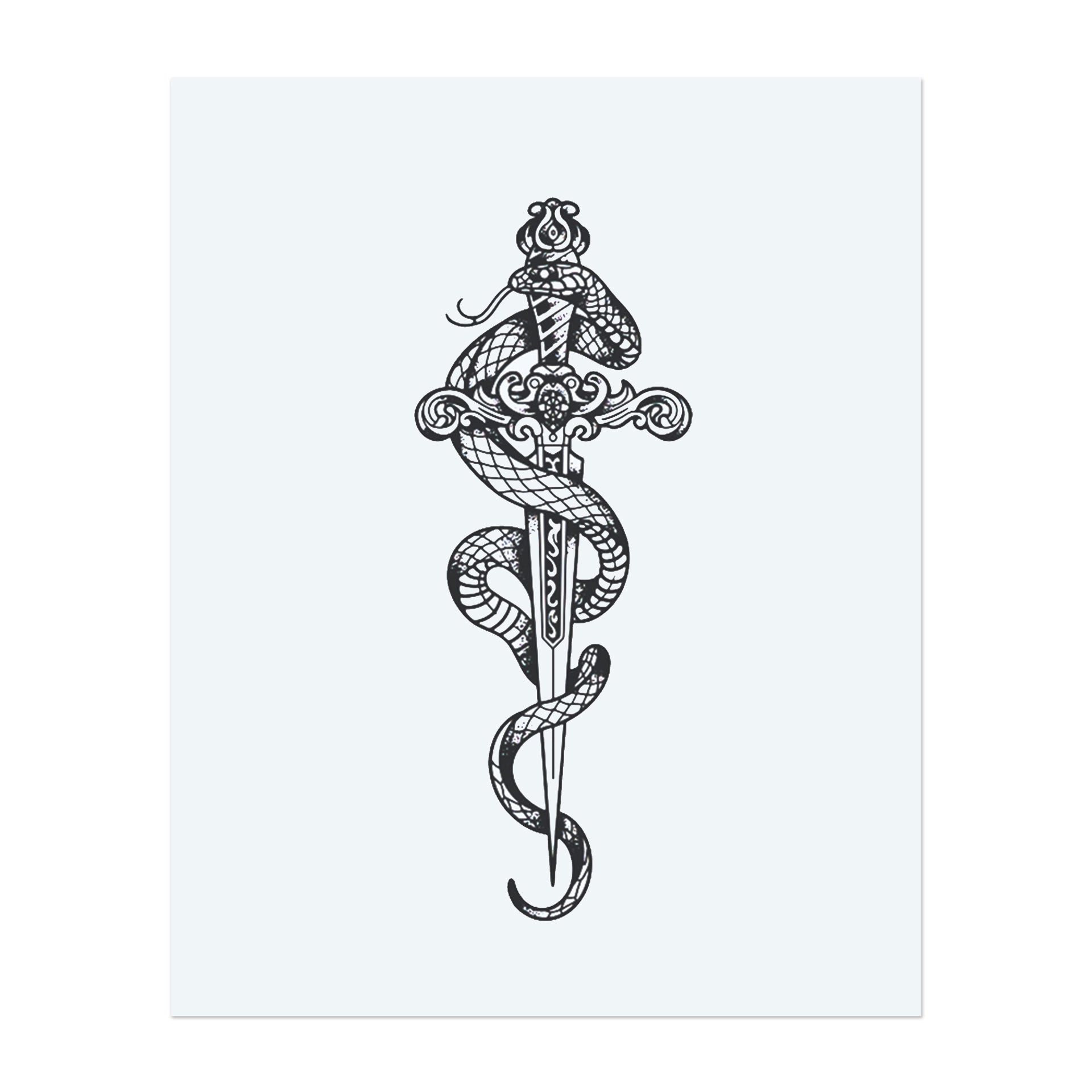 Questo intricato tatuaggio raffigura un serpente avvolto attorno a un pugnale decorato. La sua lingua sporge da una testa dettagliata appollaiata sull'elsa. Simboleggia eleganza mortale, dualità e saggezza protettiva, evocando l'equilibrio tra pericolo e controllo.
