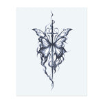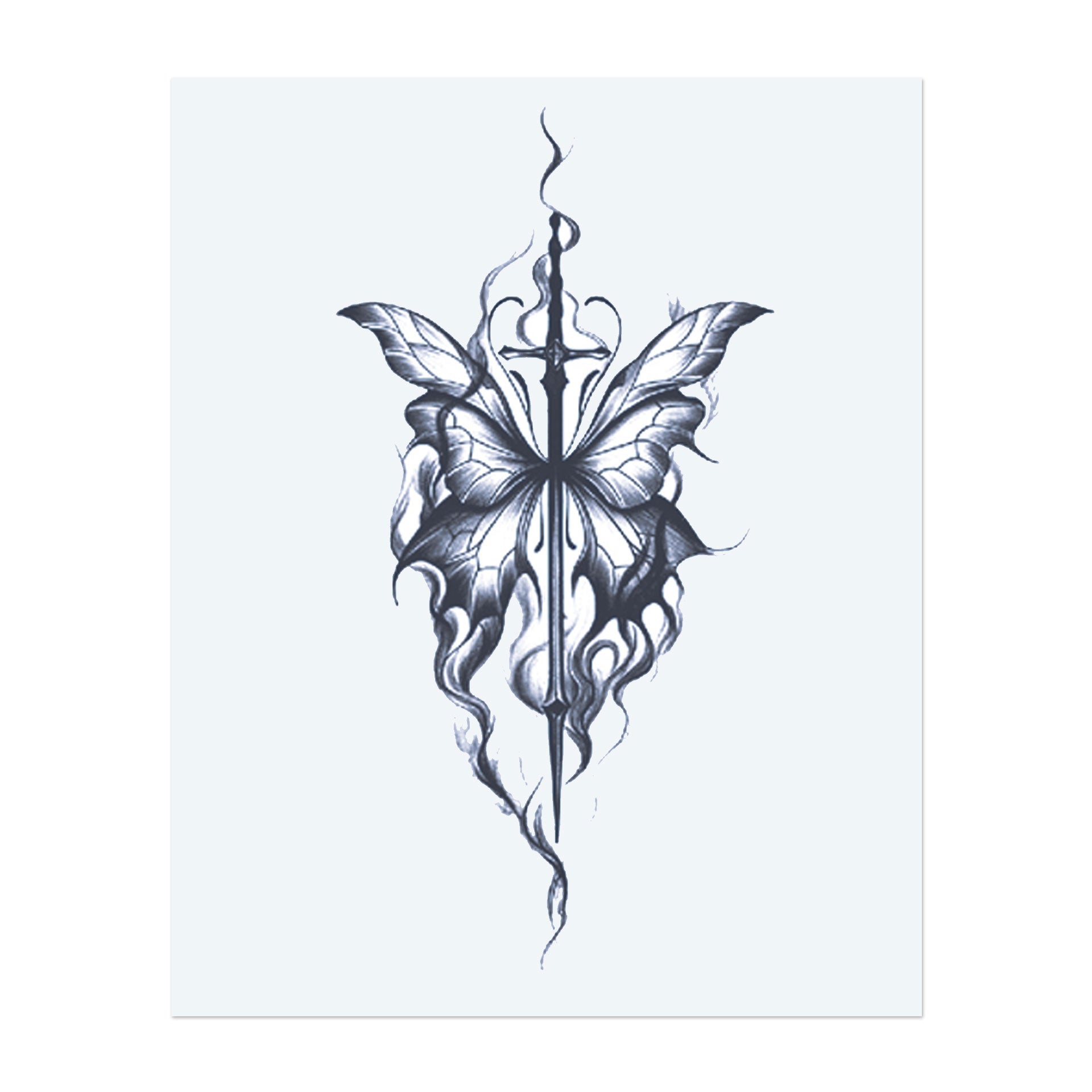 Una graziosa farfalla con ali di fiamme luminose e fluenti, incentrata su una spada. Il tatuaggio unisce delicatezza e forza, simboleggiando trasformazione e resilienza, mentre la spada fende il fumo della battaglia.