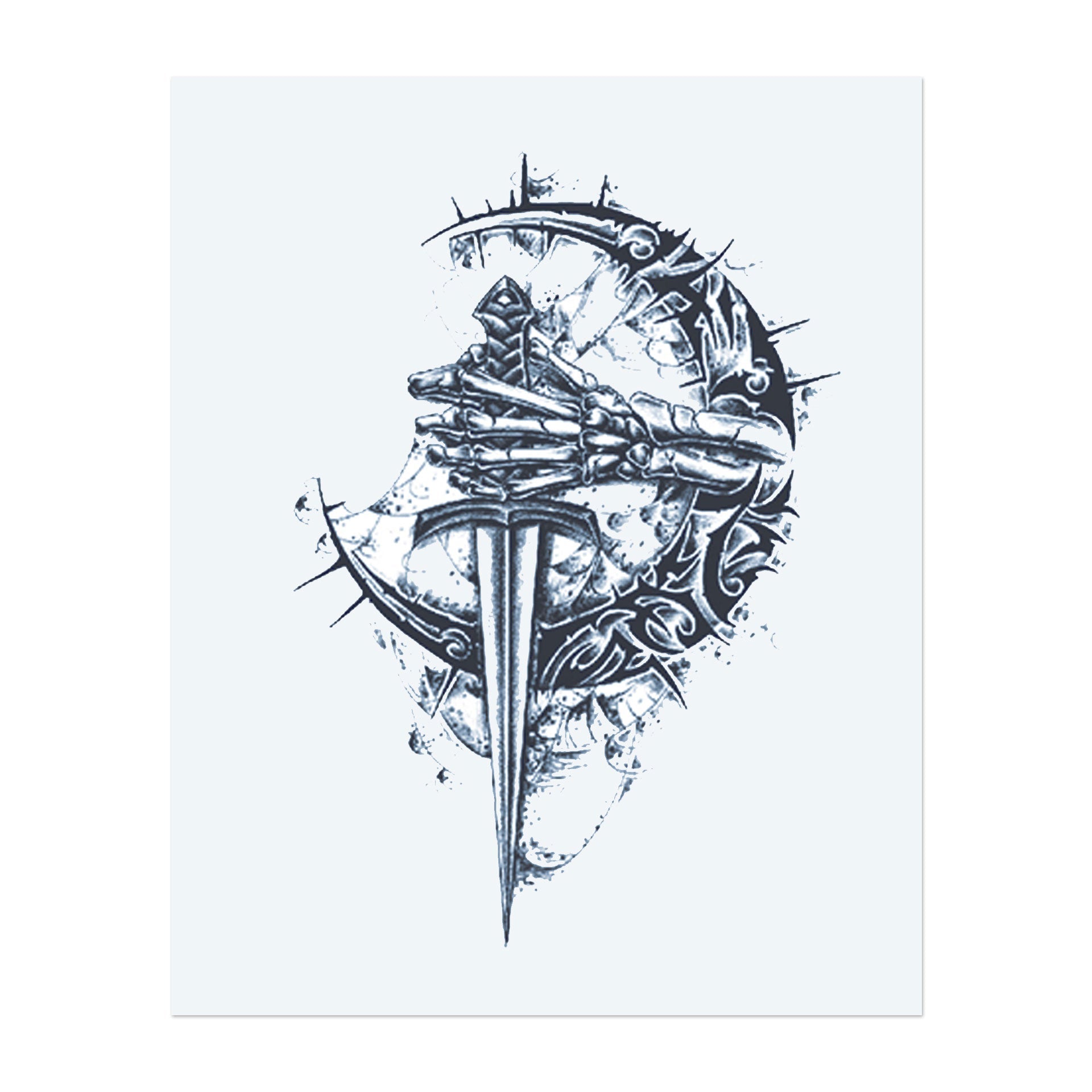 Una spada affilata che trafigge un cerchio di spine circondato da disegni intricati. La spada rappresenta forza e resilienza, mentre le spine simboleggiano le sfide. Il tatuaggio ha un disegno spigoloso e spaventoso che esprime forza e determinazione.