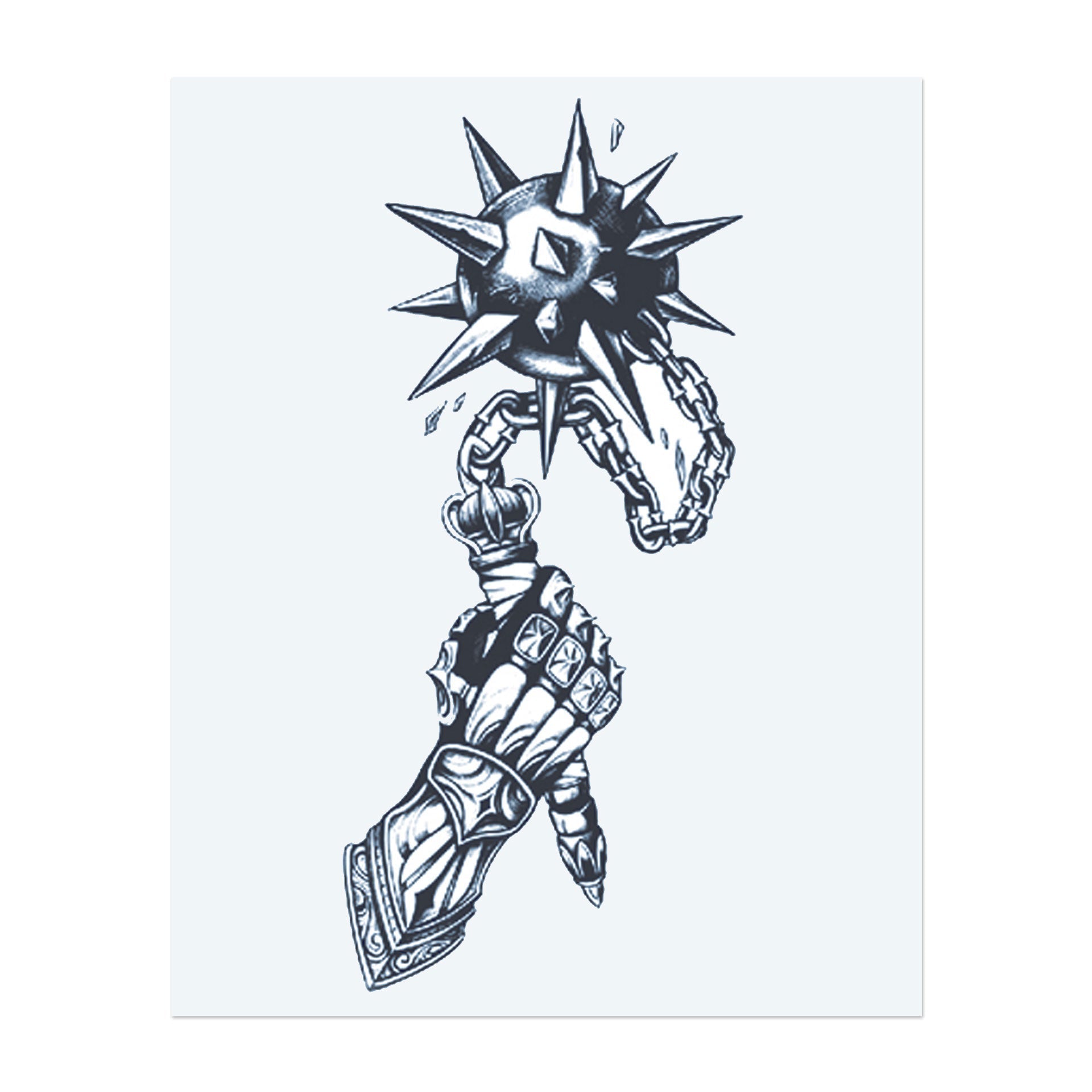 Una mano corazzata che regge una stella del mattino appuntita su una catena. Questo disegno rappresenta forza, resilienza e la capacità di superare le sfide con potenza e determinazione. Ideale per chi abbraccia il proprio spirito guerriero.