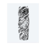 Un inquietante occhio rettiliano scruta da ombre vorticose sopra teschi ringhianti e texture barocche. Forme simili ad artigli attraversano il design, fondendo morte e vigilanza in una visione gotica di paura e controllo. Un capolavoro audace e surreale di oscura eleganza.