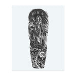 Un guerriero bendato è in piedi con una spada, incorniciato da un orologio, teschi e rose che volteggiano. Serpenti si contorcono ai suoi piedi, mentre orologi e ornamenti gotici roteano sotto. Questo tatuaggio simboleggia la giustizia, la mortalità e l'implacabile potere del destino.
