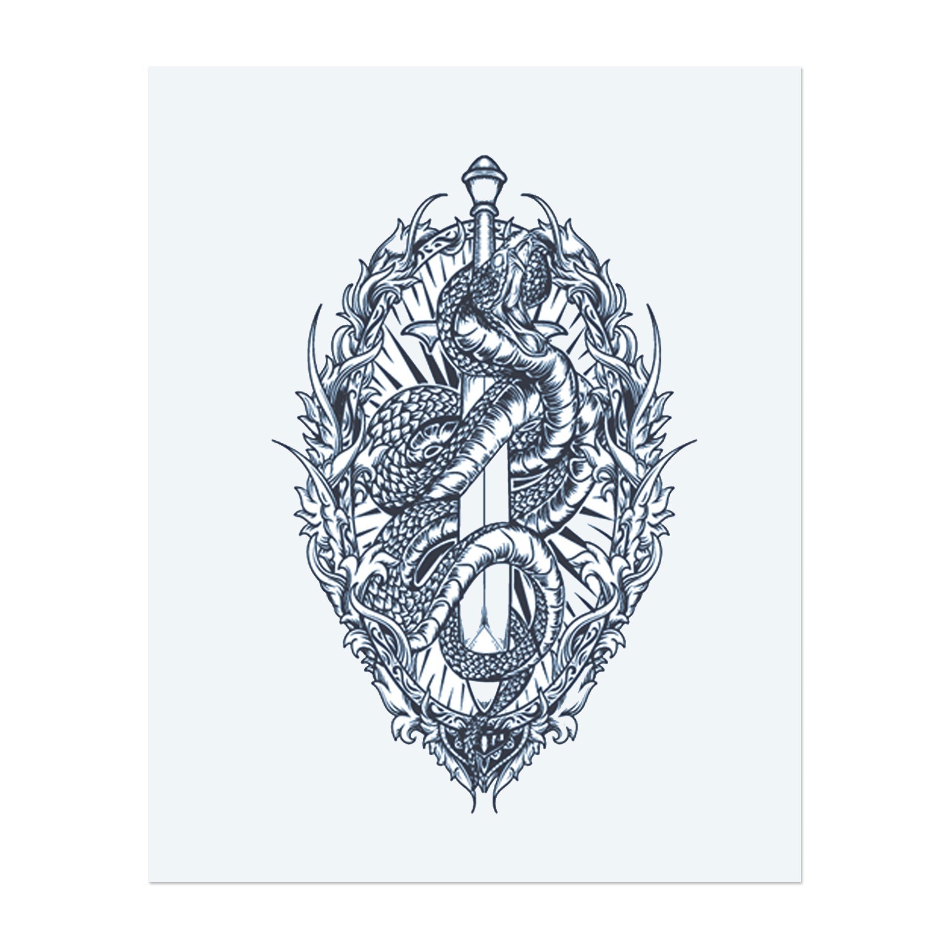 Una spada circondata da serpenti intrecciati, coronata di spine e con dettagli elaborati. Questo disegno simboleggia potere, protezione e trasformazione, e riflette sia il pericolo che la saggezza. Ideale per chi apprezza la forza e l'equilibrio tra la vita e la morte.