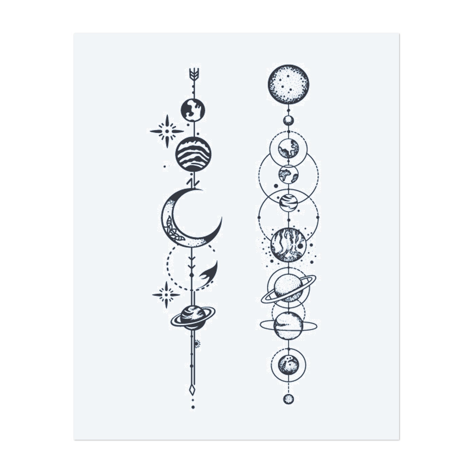 Una straordinaria combinazione di corpi celesti, tra cui lune, pianeti e stelle, collegati da orbite complesse. Questo tatuaggio simboleggia il vasto universo, l'equilibrio e l'armonia tra il cosmo e l'individuo.