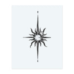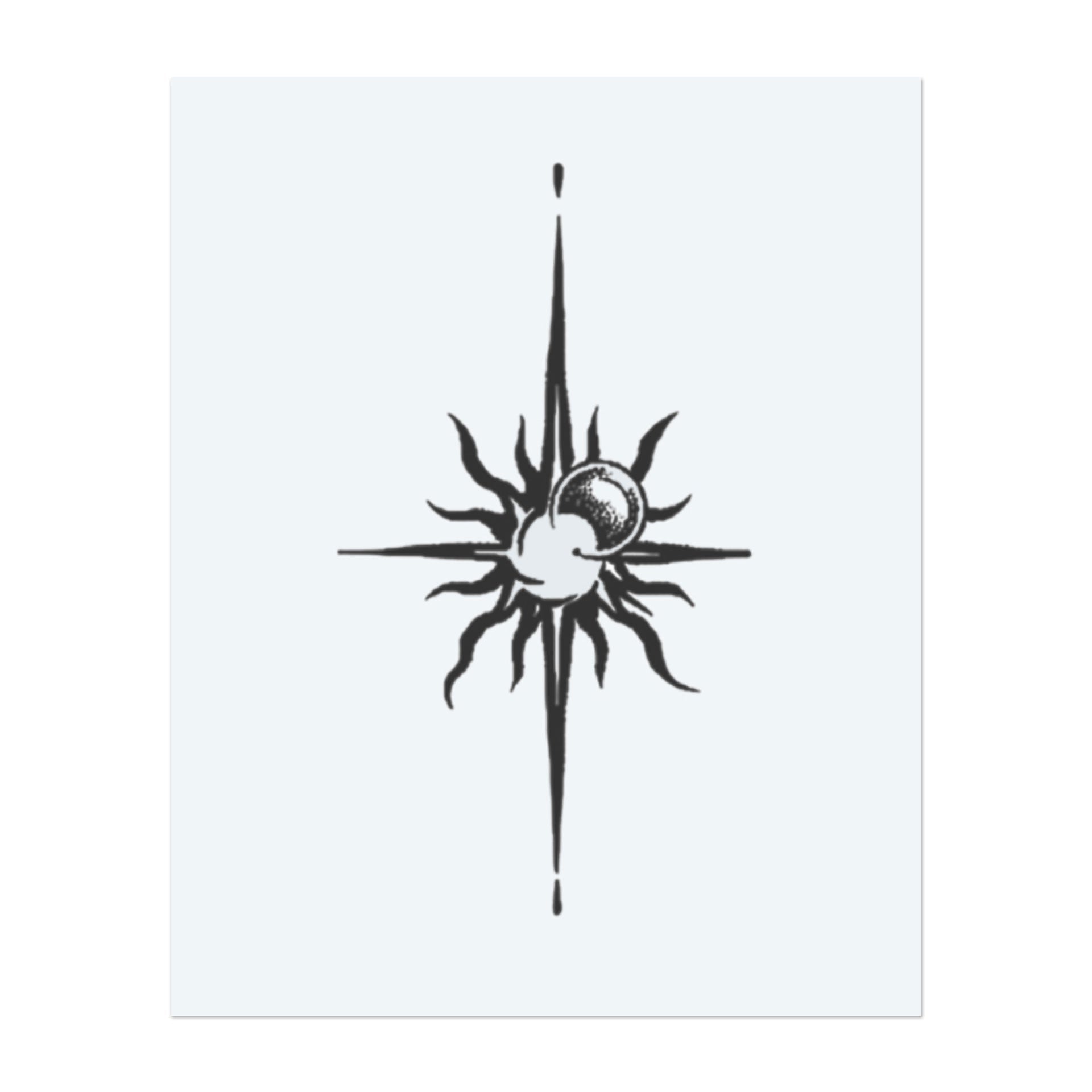 Un disegno celeste che collega il sole e la luna con una stella a quattro punte. I raggi vorticosi e il centro cosmico trasmettono equilibrio e guida, rendendolo un simbolo perfetto per la guida interiore e l'energia cosmica.