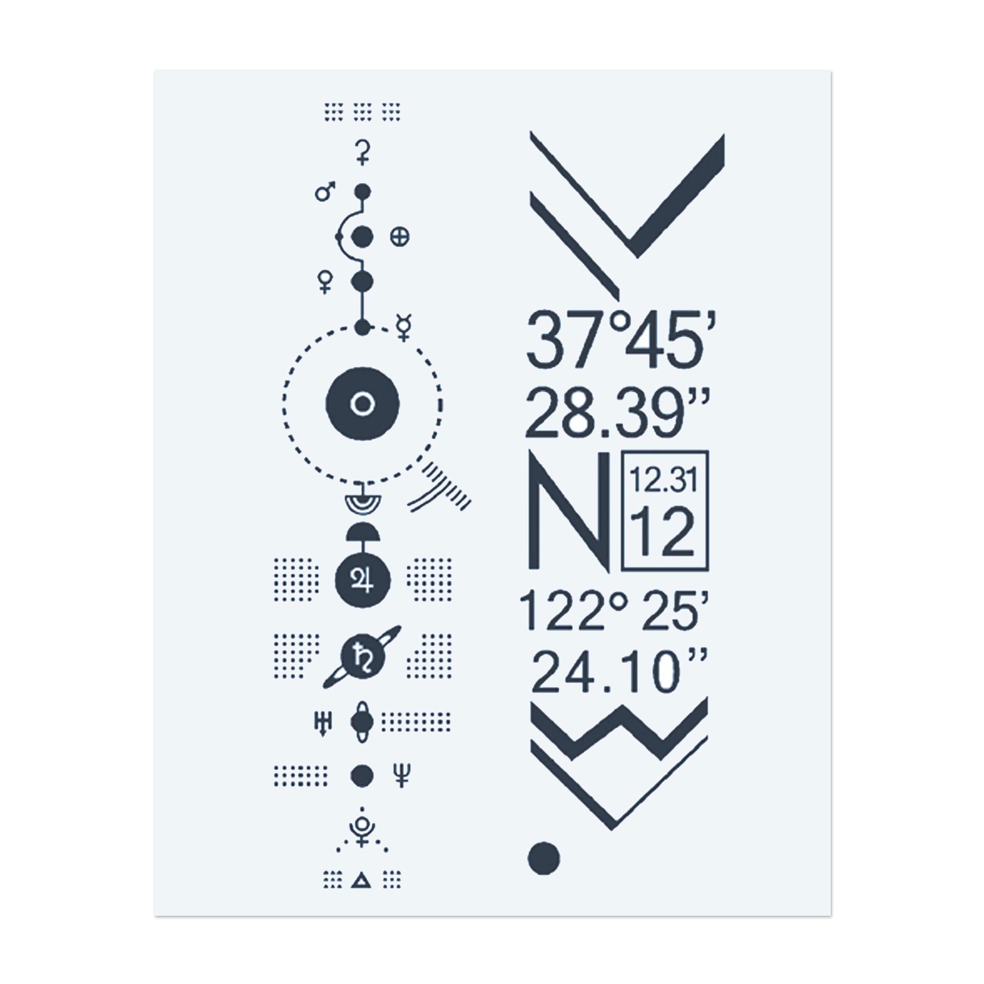 Un tatuaggio moderno che presenta un mix di forme geometriche, coordinate e simboli per creare un disegno astratto. I numeri e i segni direzionali indicano un viaggio o un significato nascosto. Ideale per chi ama il mistero, la scoperta e i significati personali.