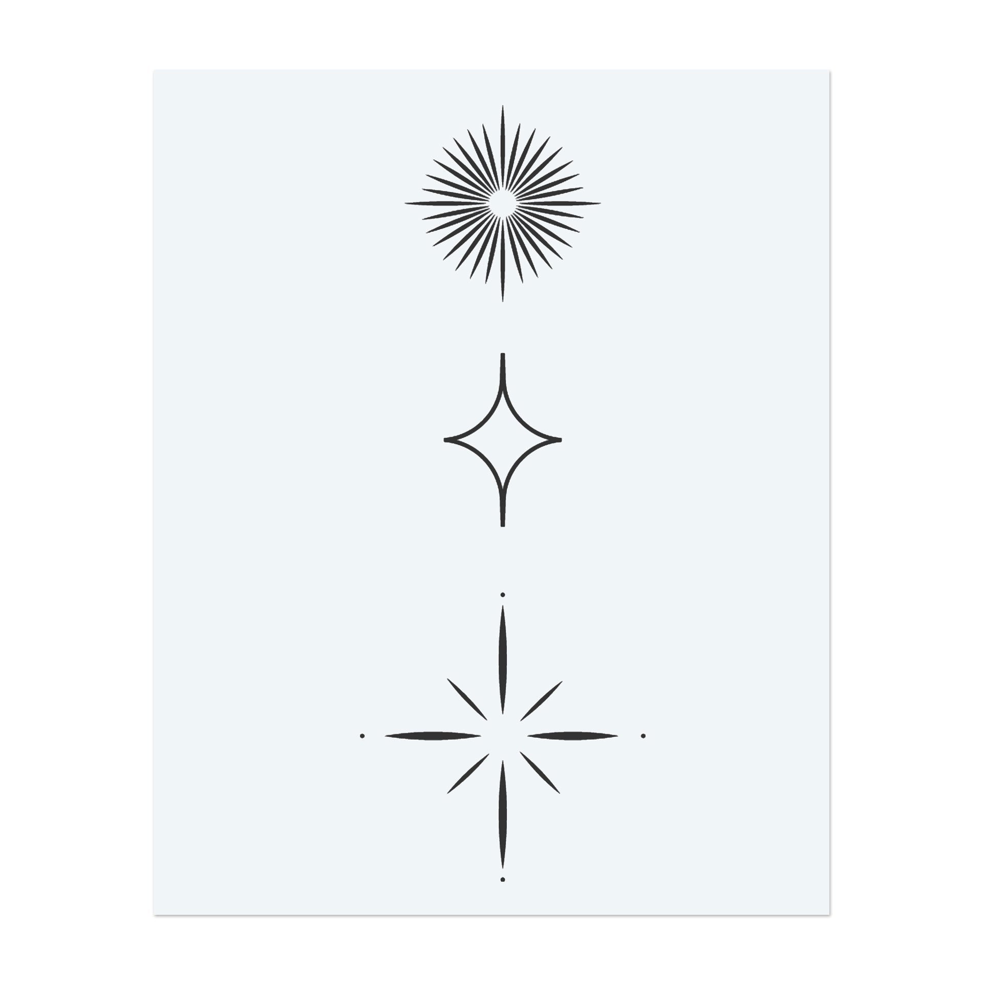 Un armonioso set di tre motivi a stella stilizzati: un cerchio radiale, un diamante delicatamente curvo e una classica stella incrociata con puntini sottili. Ideale per un look moderno e mistico dalle linee pulite.
