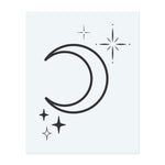 Una graziosa luna crescente incorniciata da stelle scintillanti di varie forme e dimensioni. Questo design celestiale emana mistero, intuizione e bellezza cosmica, perfetto per un look da sogno ispirato al cielo notturno.