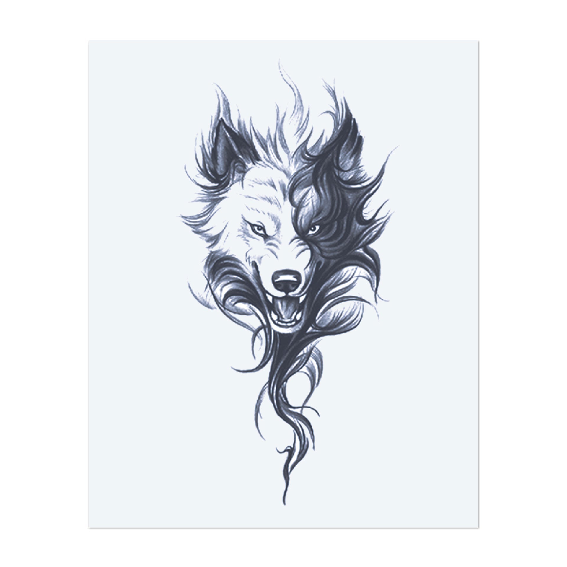 Un volto di lupo bianco e nero con pelliccia fluente che fonde luce e ombra. Questo tatuaggio realistico illustra lo spirito del lupo, forte e selvaggio, pronto a proteggere.