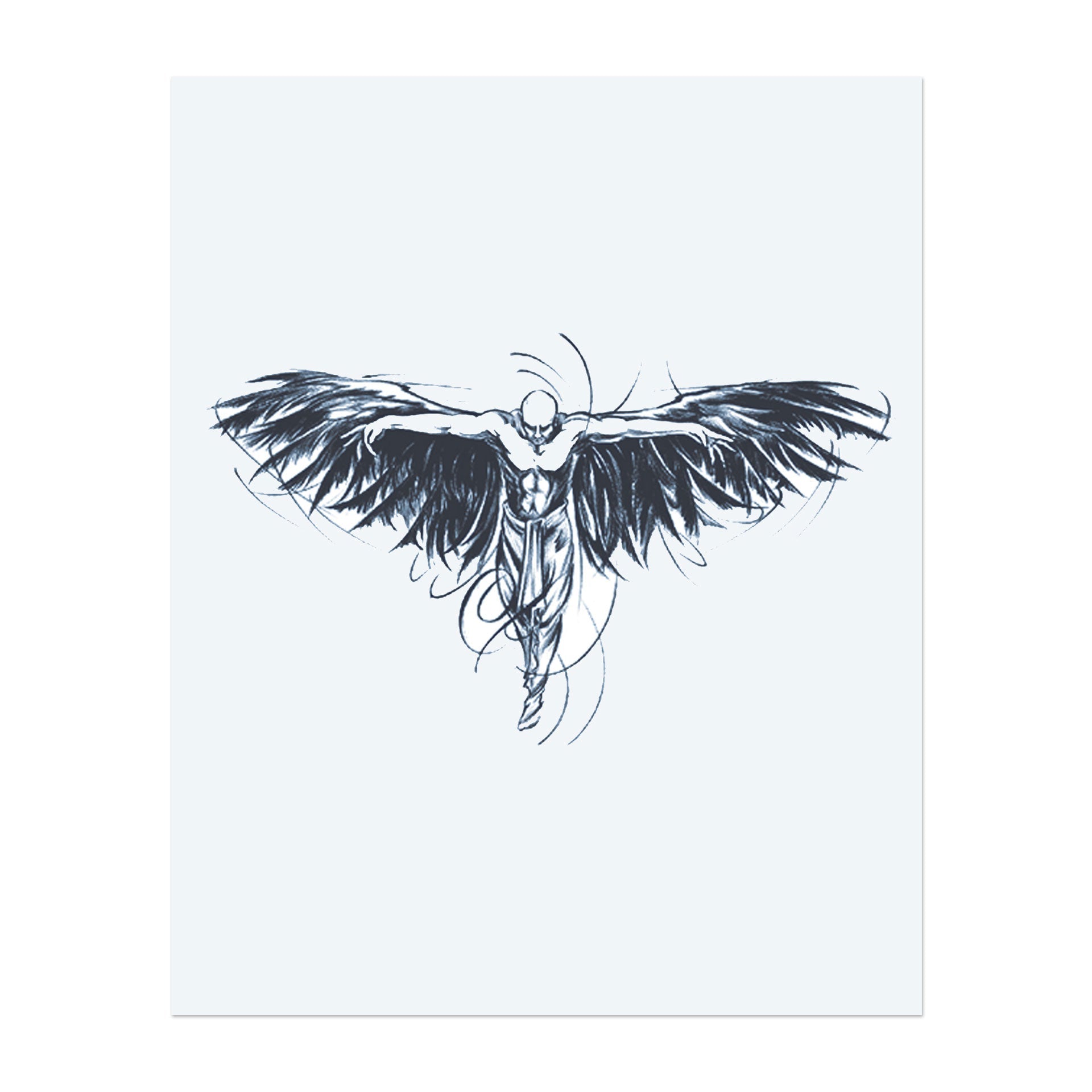 Un angelo con grandi ali fluenti spiegate, che fluttuano nell'aria. Il movimento delle ali e la silhouette trasmettono un senso di libertà e di volo. Il tatuaggio cattura la sensazione di forza, grazia e liberazione.