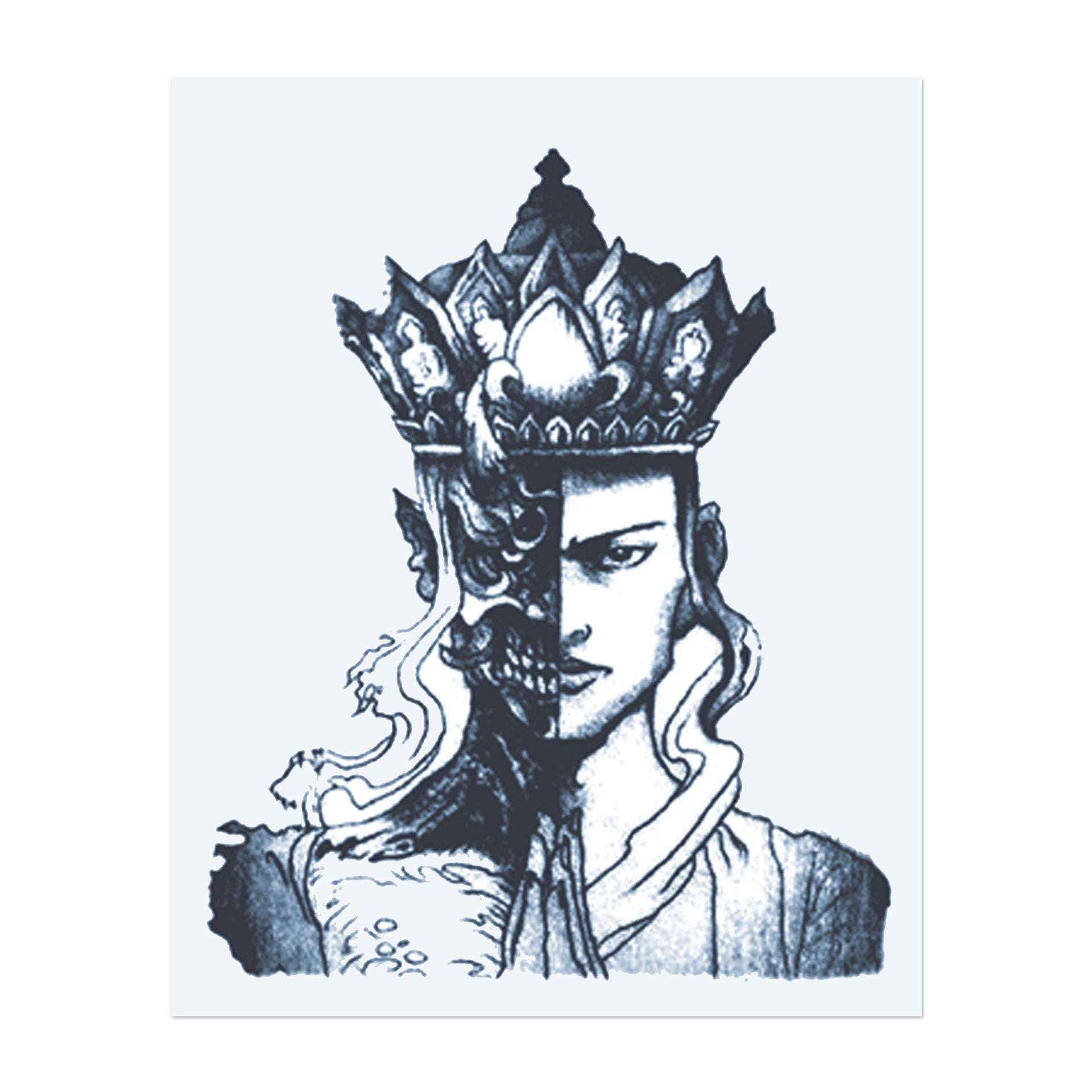 Un tatuaggio del volto di un re che indossa una corona, con metà del viso che esprime nobiltà e l'altra metà nascosta nell'ombra. Questo disegno rappresenta l'equilibrio tra potere e vulnerabilità e simboleggia la leadership, la forza e la dualità della natura umana.