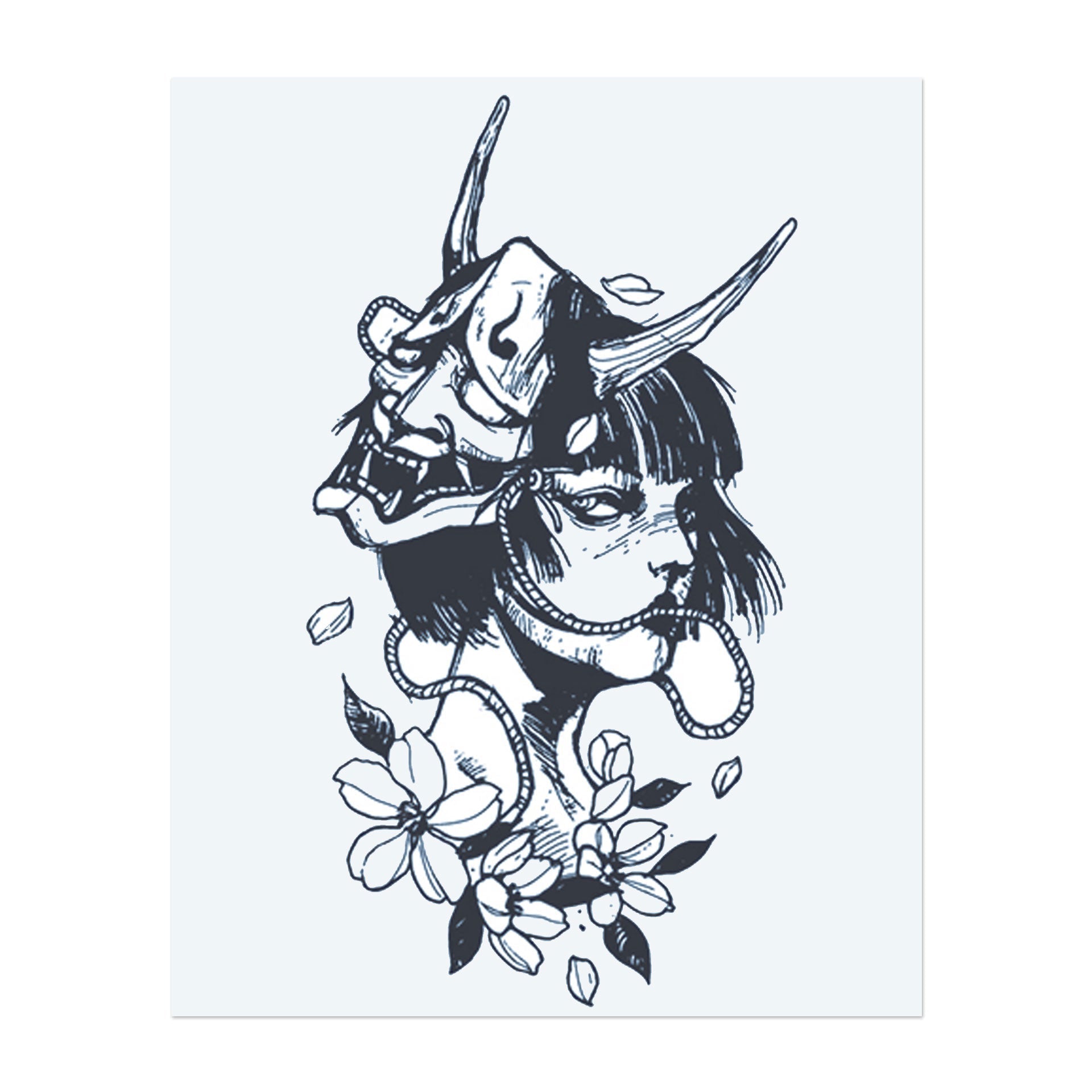 Un tatuaggio sorprendente di una donna che indossa una tradizionale maschera Oni, circondata da delicati fiori. Il disegno combina bellezza e oscurità, simboleggiando forza, mistero e trasformazione. Perfetto per chi abbraccia sia il potere che la grazia.