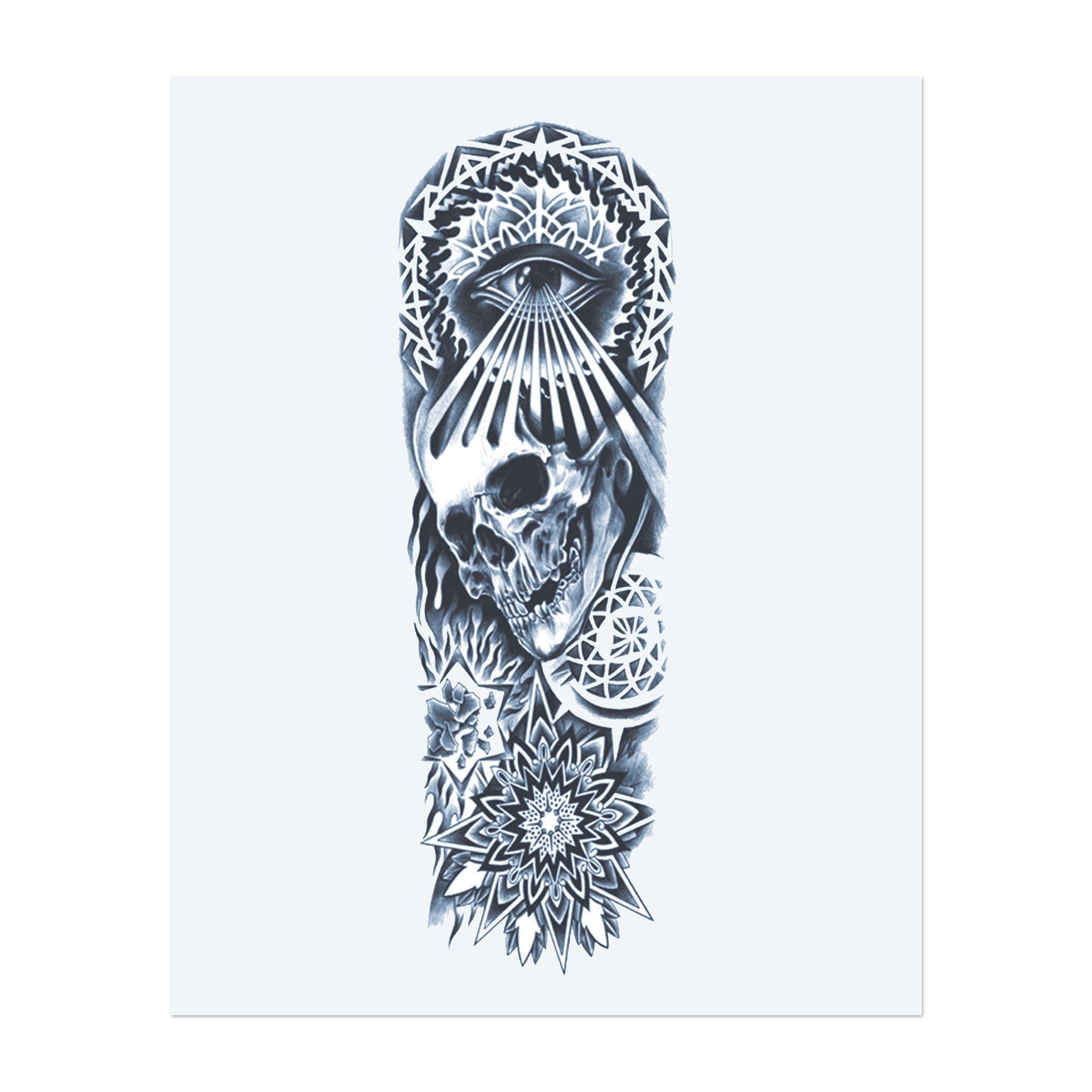 Questa manica combina un teschio con motivi geometrici e un occhio onniveggente, simboleggiando il legame tra vita, morte e la visione divina che ci guida. Il design artistico rappresenta i misteri dell'esistenza e lo svolgersi del destino.