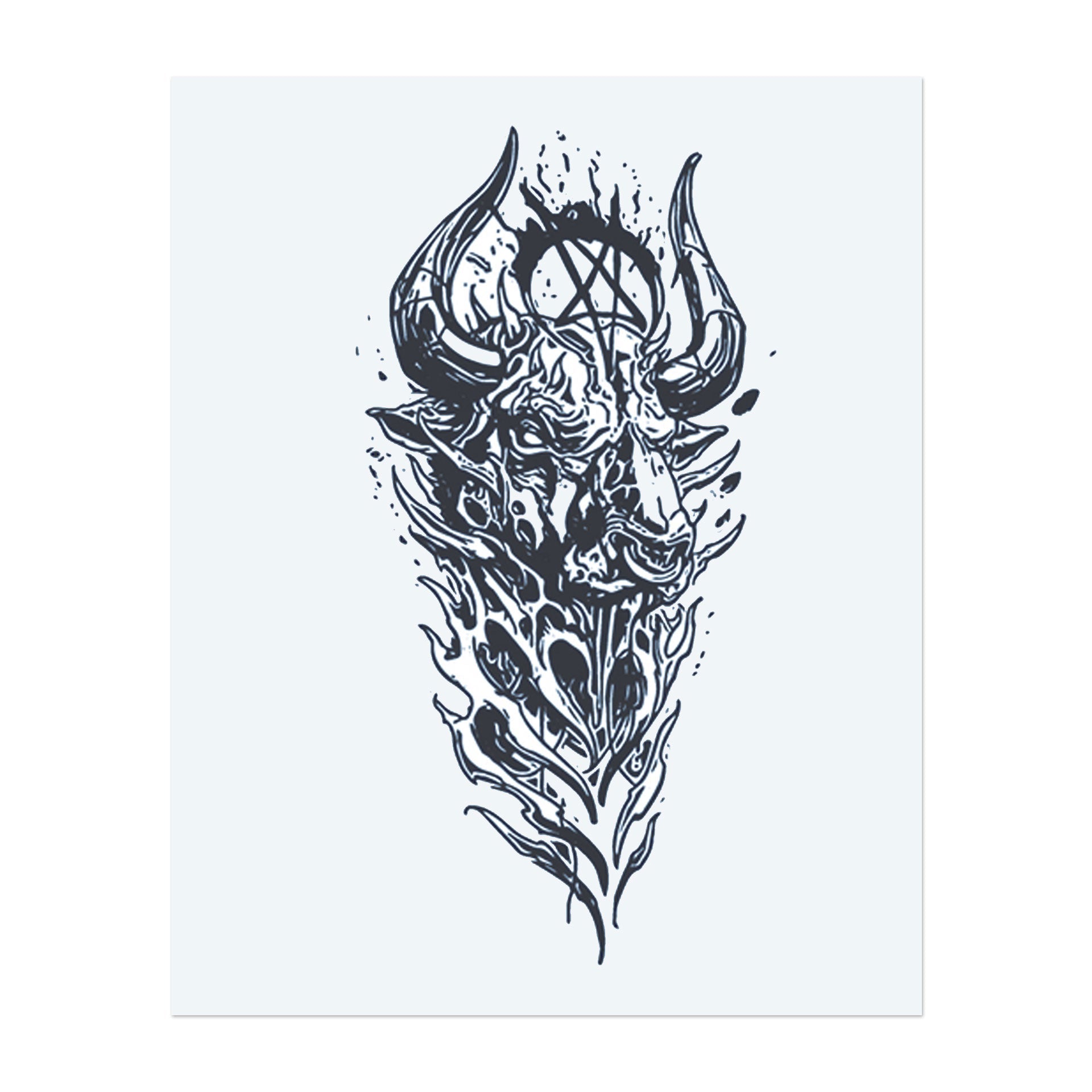 Una testa di toro con corna affilate e un minaccioso pentagramma sopra, circondato da motivi caotici e fluidi. Questo disegno simboleggia forza, aggressività e ribellione. Perfetto per chi abbraccia il proprio spirito oscuro e indomito.