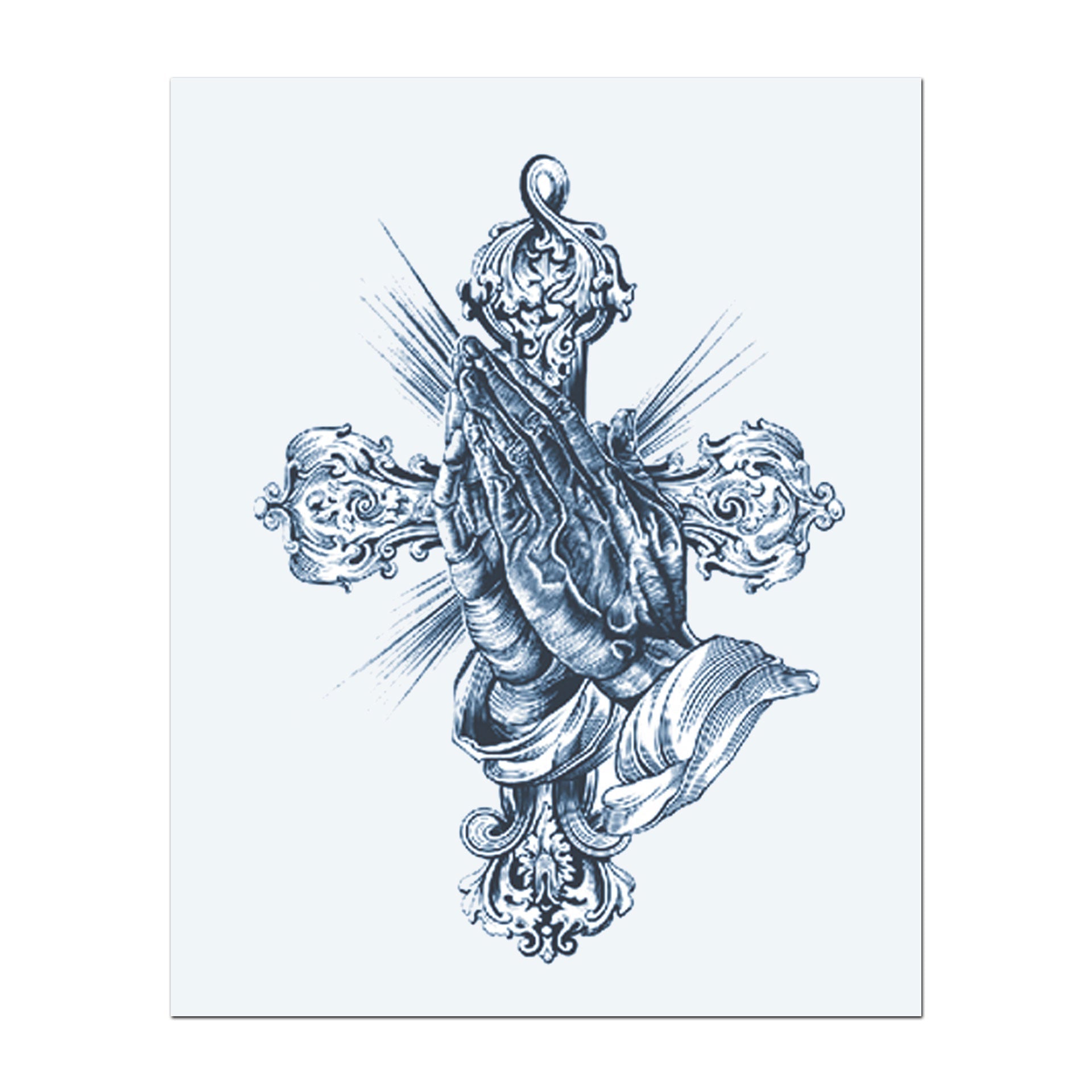 Due mani in preghiera davanti a una croce dettagliata con linee luminose. Questo tatuaggio realistico simboleggia fede, speranza e fiducia, ricordandoti di rimanere forte e di credere ogni giorno.