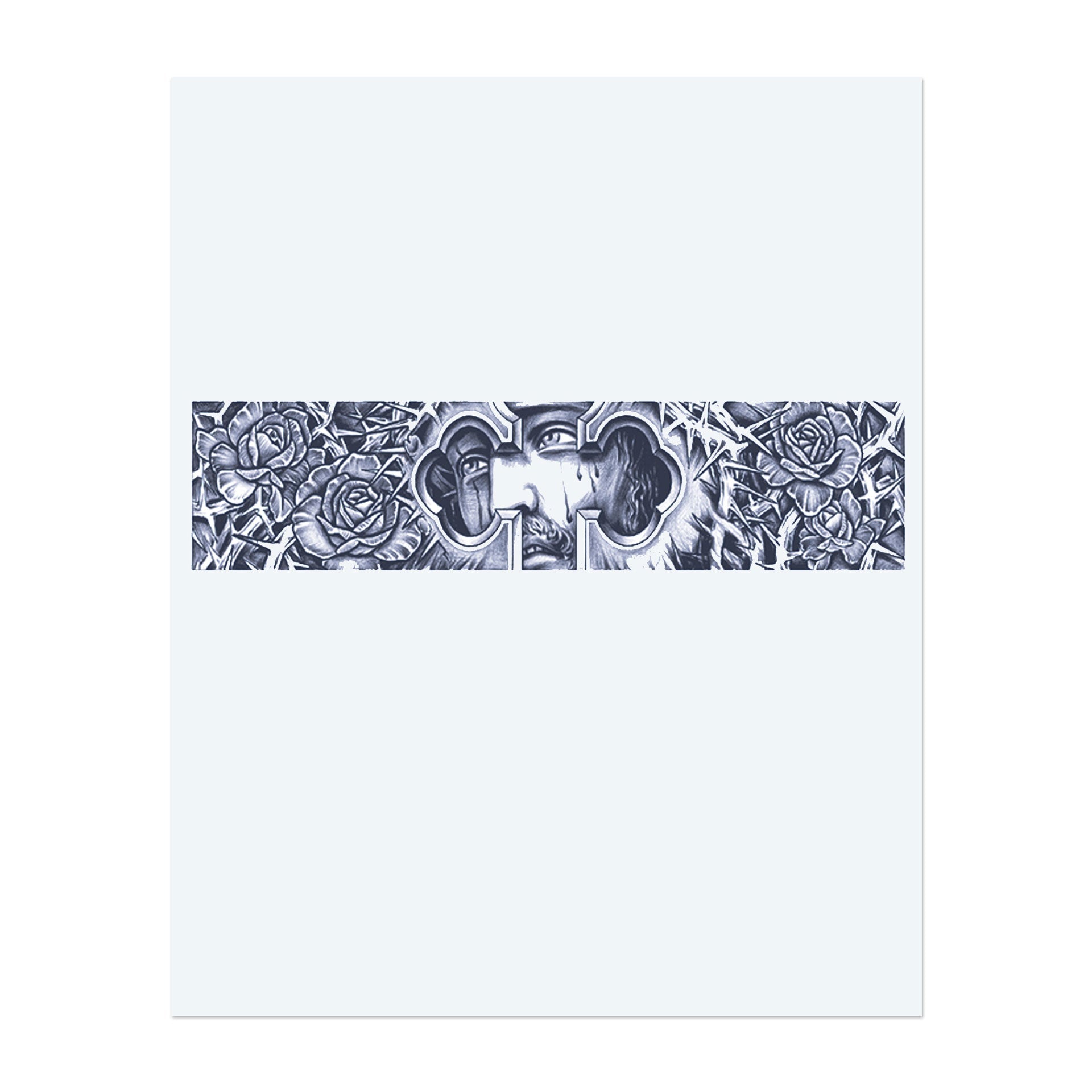 Un potente tatuaggio a nastro raffigurante il volto di Gesù, incorniciato da rose e spine. Questo tatuaggio simboleggia fede, sacrificio e forza spirituale, catturando emozioni profonde e devozione.