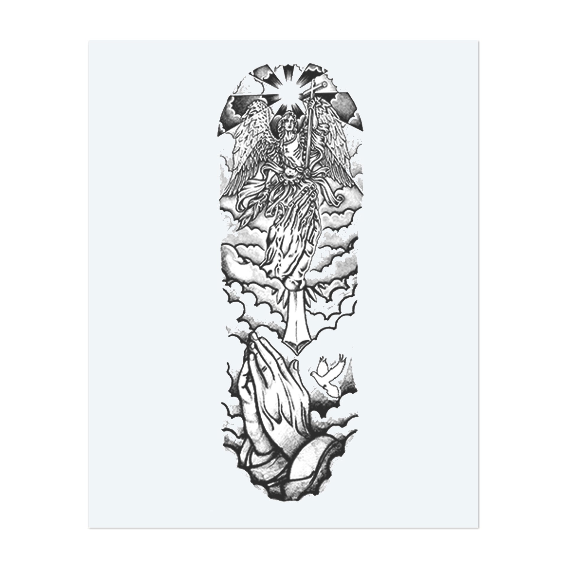 Un angelo con un bastone si libra tra raggi radiosi e nuvole ondeggianti, incoronato da un cielo stellato. In basso, mani giunte in preghiera e una colomba in volo simboleggiano pace e devozione. Questo tatuaggio incarna la grandezza spirituale e la serenità divina in uno stile classico e riverente.