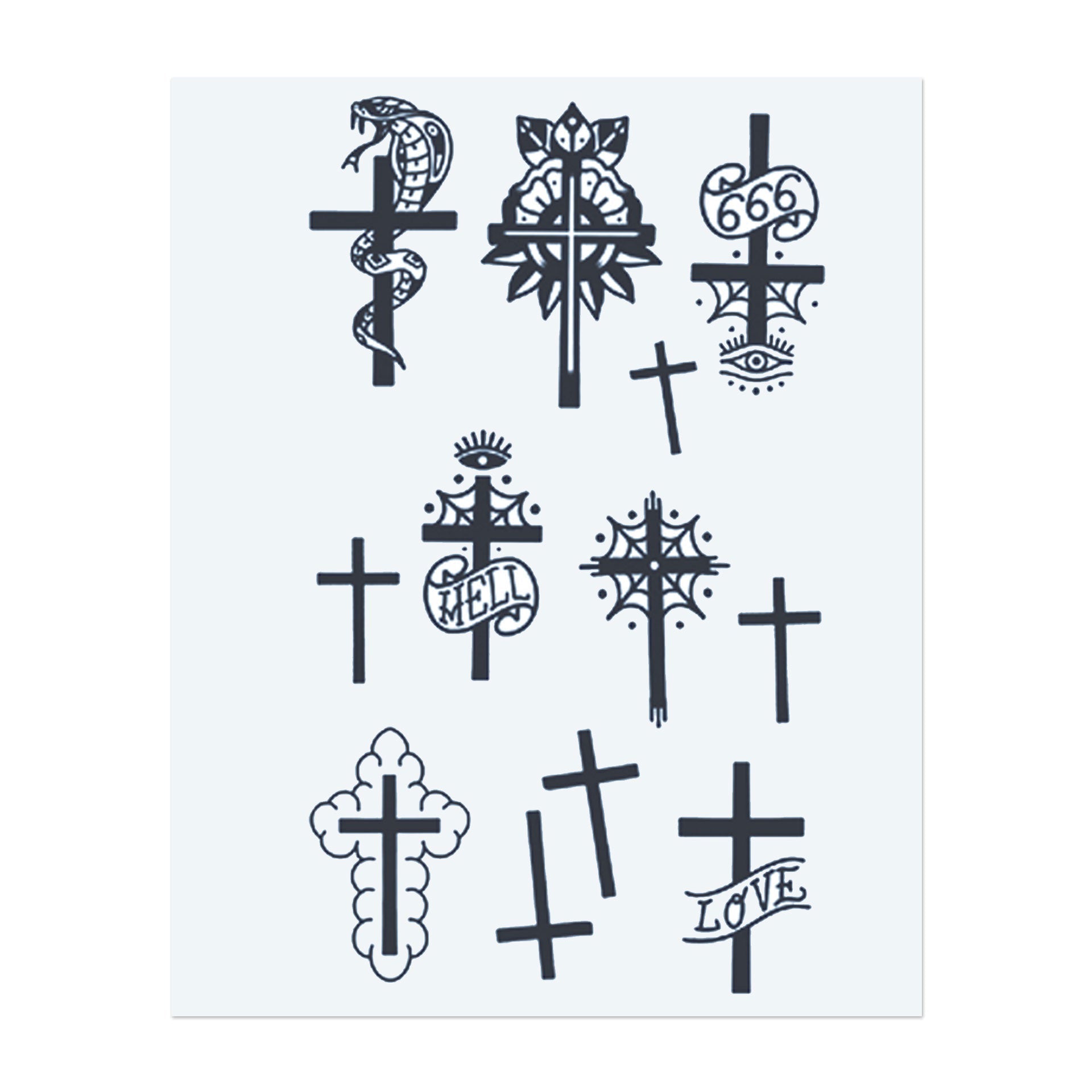 Una serie di croci in vari stili, che spaziano da disegni elaborati con serpenti e occhi a croci più semplici con parole come "Amore" e "Inferno". Ogni simbolo riflette un diverso aspetto della spiritualità, della vita e del significato personale. Ideale per chi cerca un tatuaggio che rappresenti la fede, la lotta o le convinzioni personali.