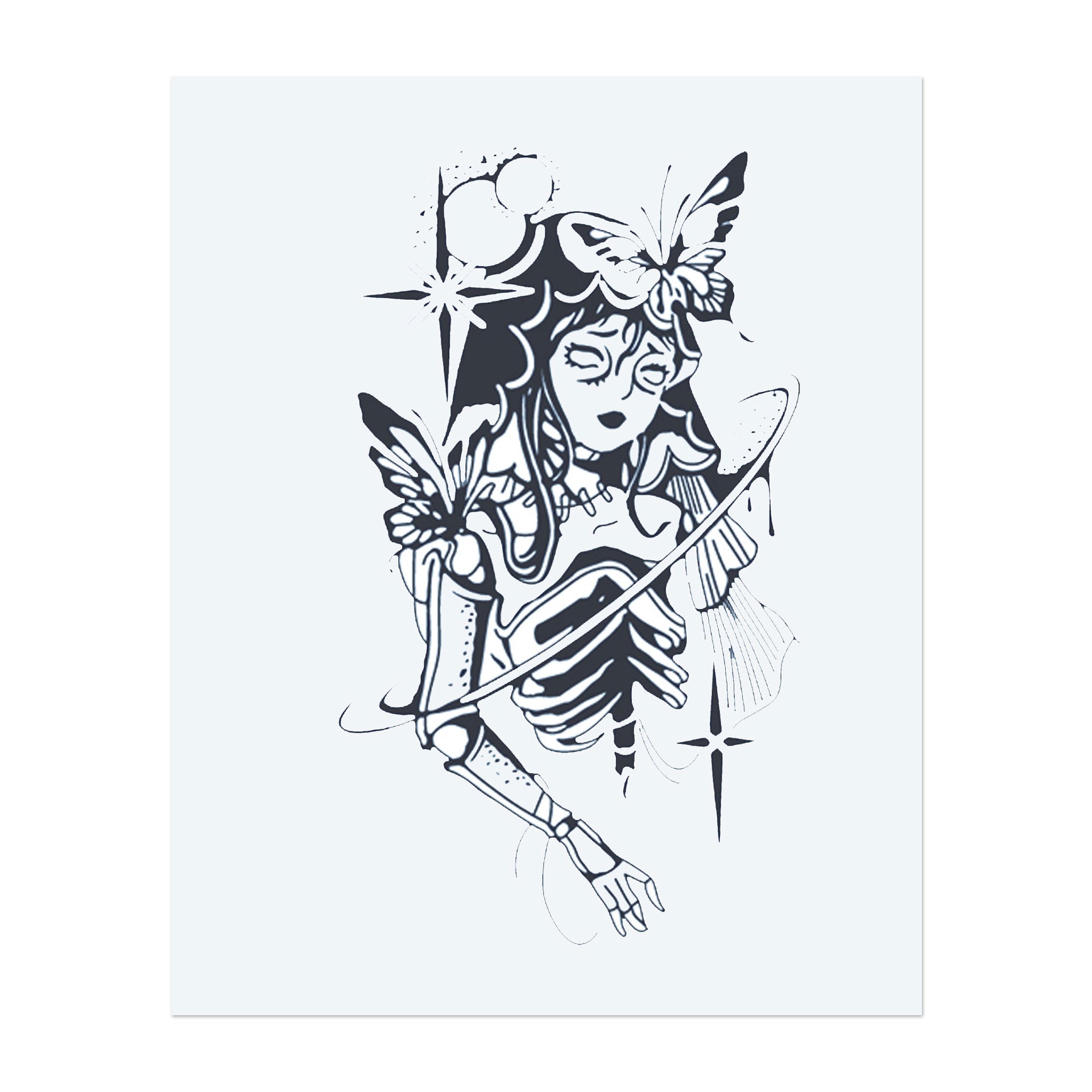 Una figura scheletrica con ali delicate, circondata da stelle e fiori. Questo design combina elementi di vita e morte, magia e trasformazione.