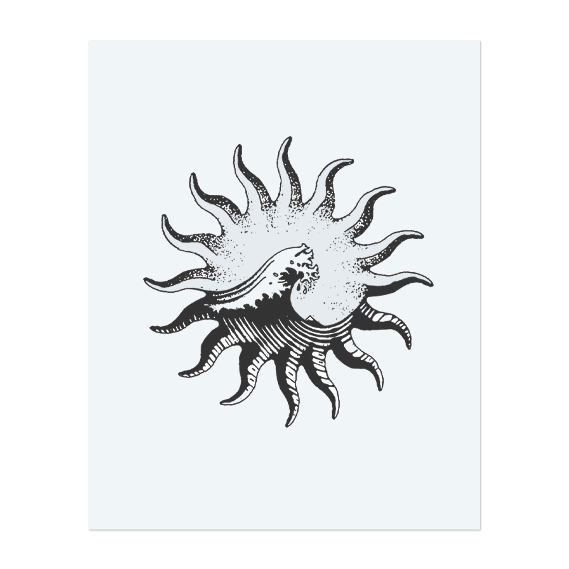 Questo tatuaggio unico combina un'onda che si infrange con la forma radiosa di un sole, i cui raggi si arricciano come tentacoli. Unisce le forze elementari e simboleggia l'equilibrio tra potenza e calore, caos e luce: una danza cosmica tra mare e cielo.