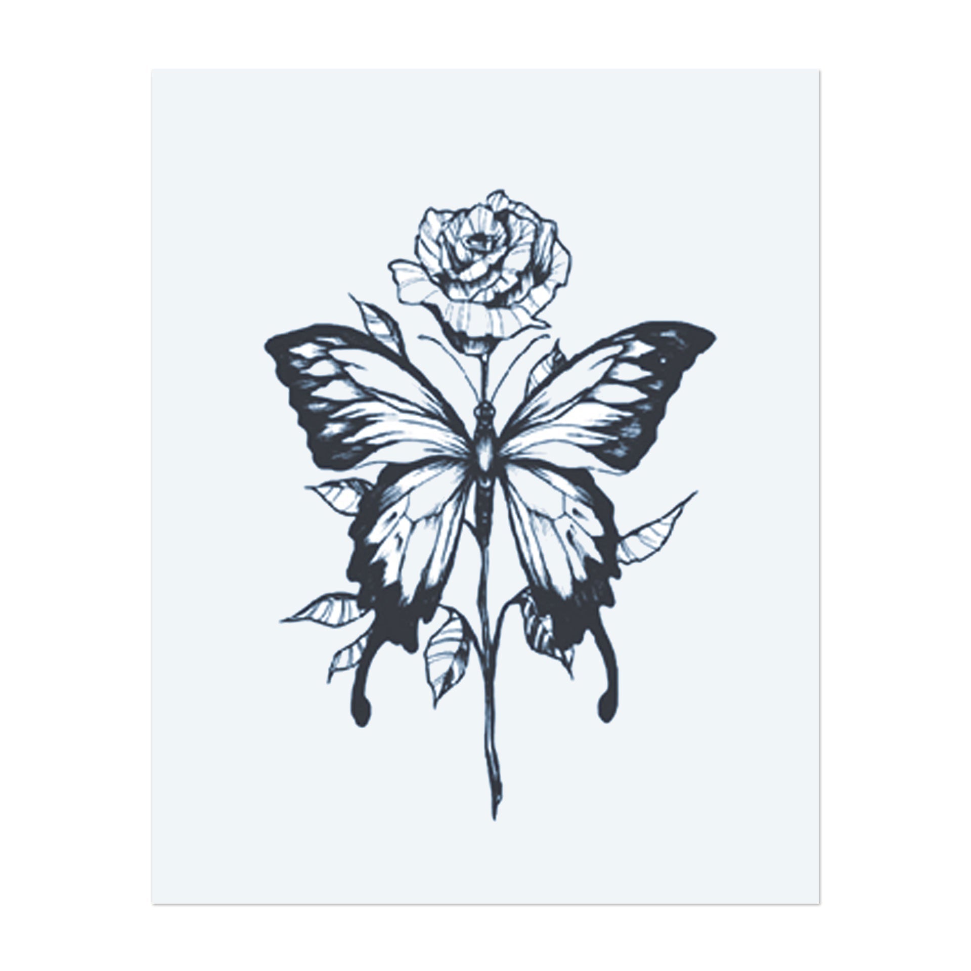 Una delicata farfalla posata su una rosa in fiore simboleggia trasformazione, bellezza e nuovi inizi. I delicati dettagli catturano sia la fragilità che la forza nell'armonioso design della natura.