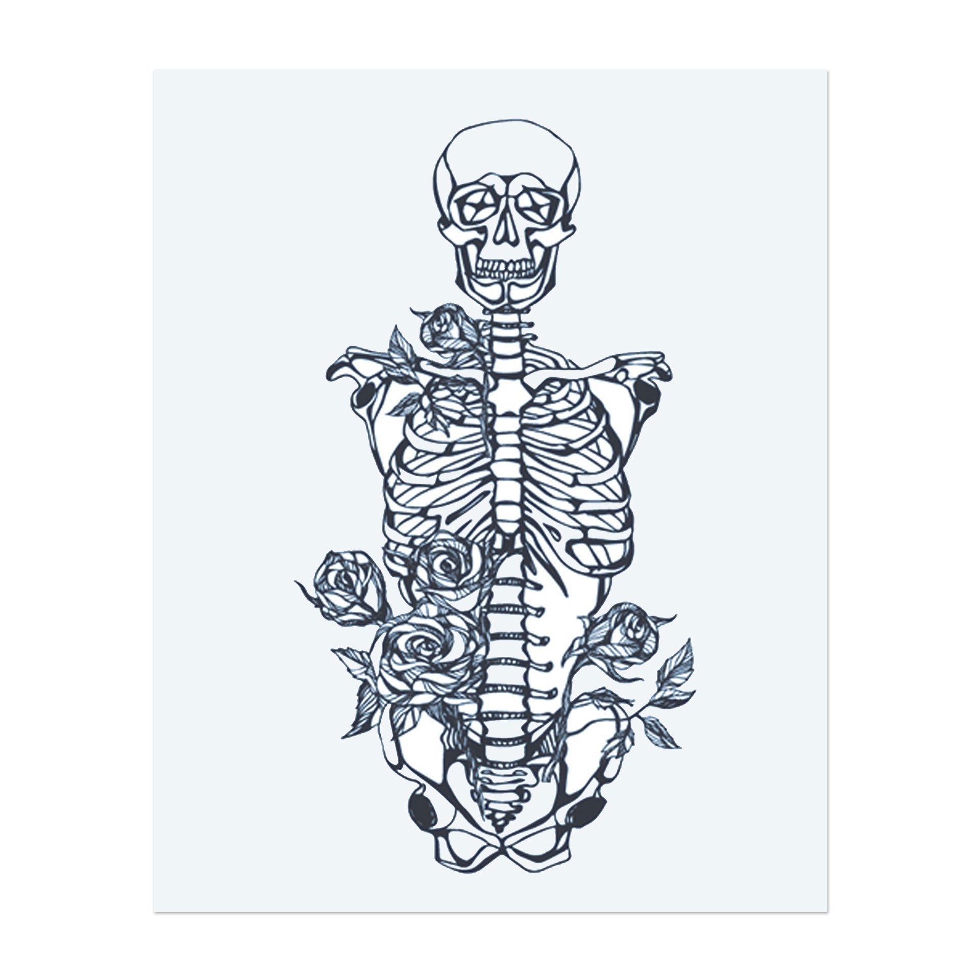 Uno scheletro dettagliato circondato da rose, a simboleggiare il delicato equilibrio tra vita e morte. I fiori rappresentano bellezza e crescita, mentre lo scheletro ci ricorda la nostra mortalità. Perfetto per chi abbraccia sia la fragilità che la bellezza dell'esistenza.