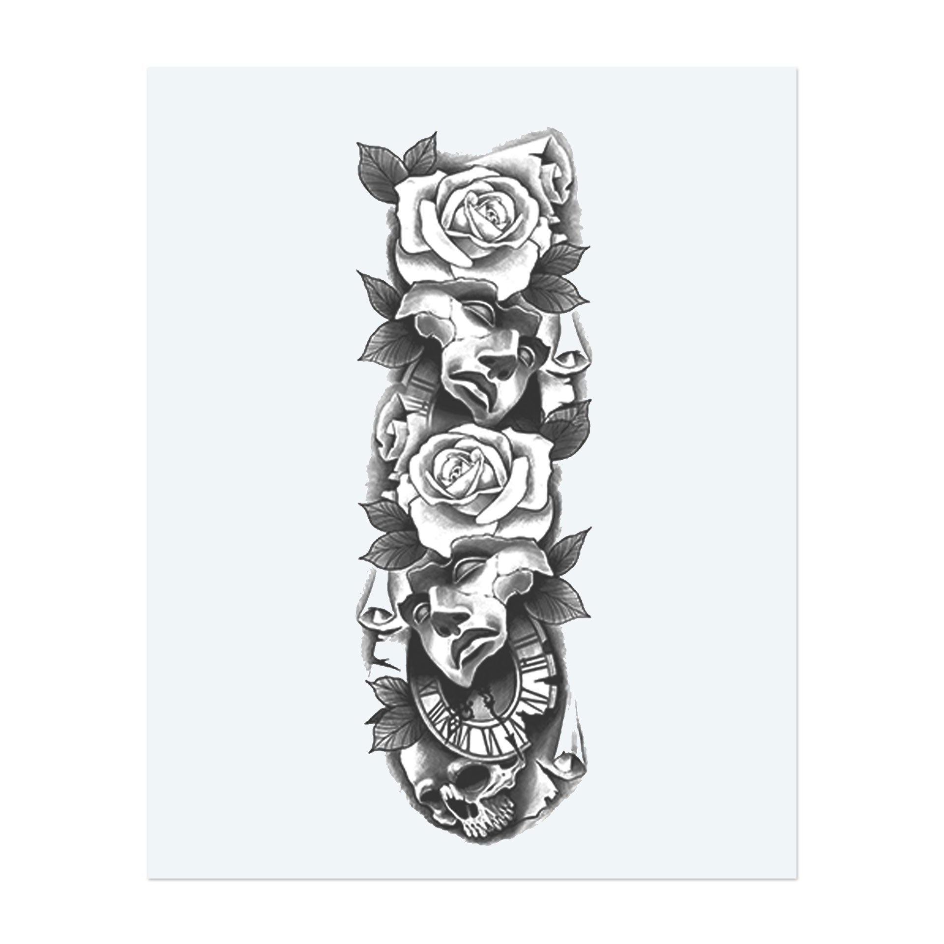 Questo tatuaggio drammatico combina maschere teatrali classiche con rose in fiore, un orologio rotto e delicati motivi a forma di teschio. Cattura il passare del tempo, la dualità di gioia e tristezza e la bellezza che permane anche nei momenti più bui della vita.