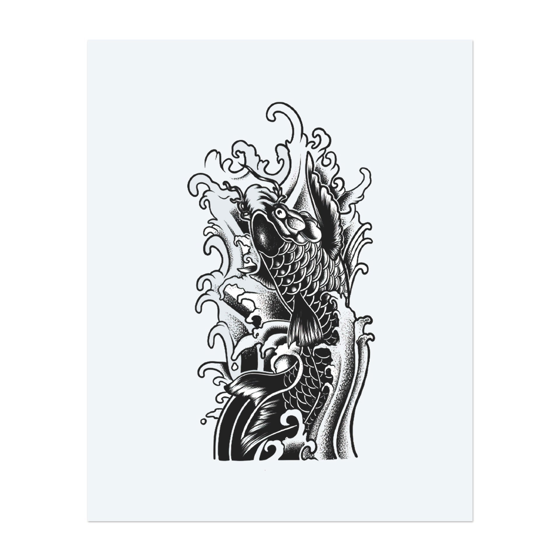 Un dinamico pesce koi salta tra le onde vorticose in questo audace design tradizionale. Le squame dettagliate e i movimenti fluidi simboleggiano forza, resistenza e trasformazione. Richiamano l'arte orientale senza tempo e la crescita personale.