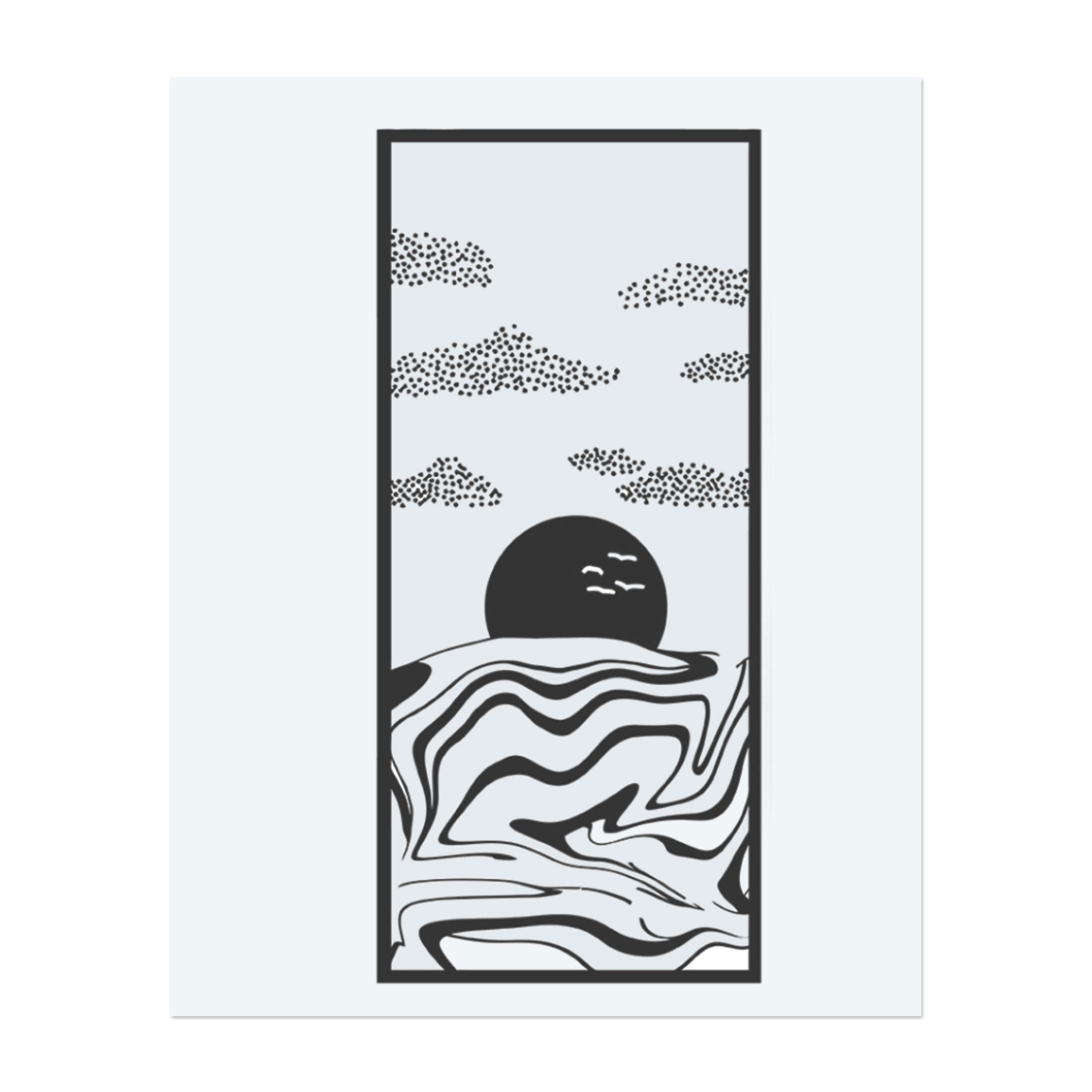 Questo tatuaggio temporaneo, incorniciato in un rettangolo minimalista, cattura un tranquillo tramonto con onde astratte che si increspano, nuvole punteggiate e uccelli che si stagliano contro il sole al tramonto. Un'armoniosa combinazione di pace e movimento che evoca una quieta contemplazione e un silenzio sognante.