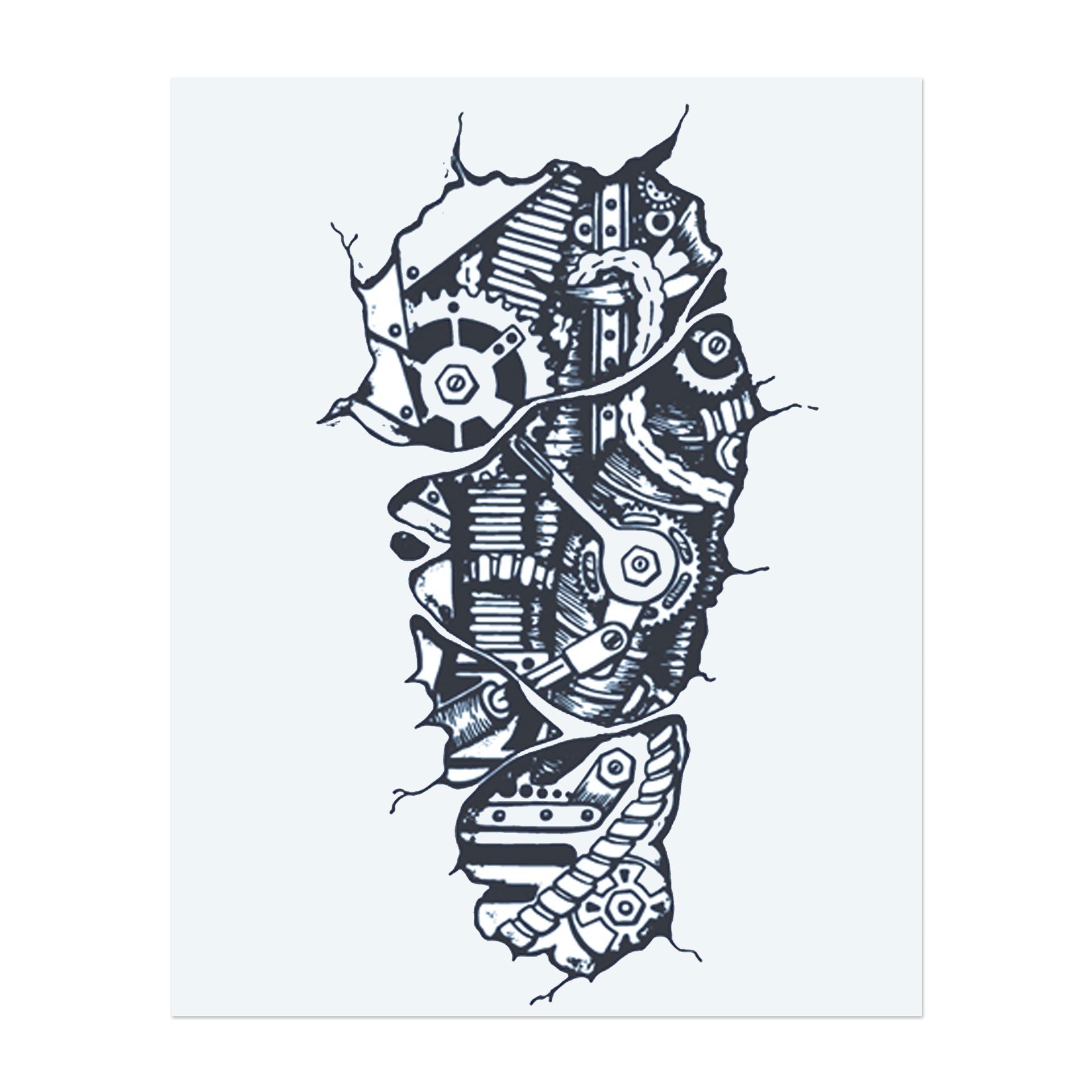 Un tatuaggio che raffigura pelle lacerata che rivela ingranaggi, barre e complessi meccanismi sottostanti. Questo disegno biomeccanico simboleggia la fusione tra uomo e macchina, rappresentando forza, precisione e spirito futuristico. Ideale per chi abbraccia la tecnologia e la resilienza.