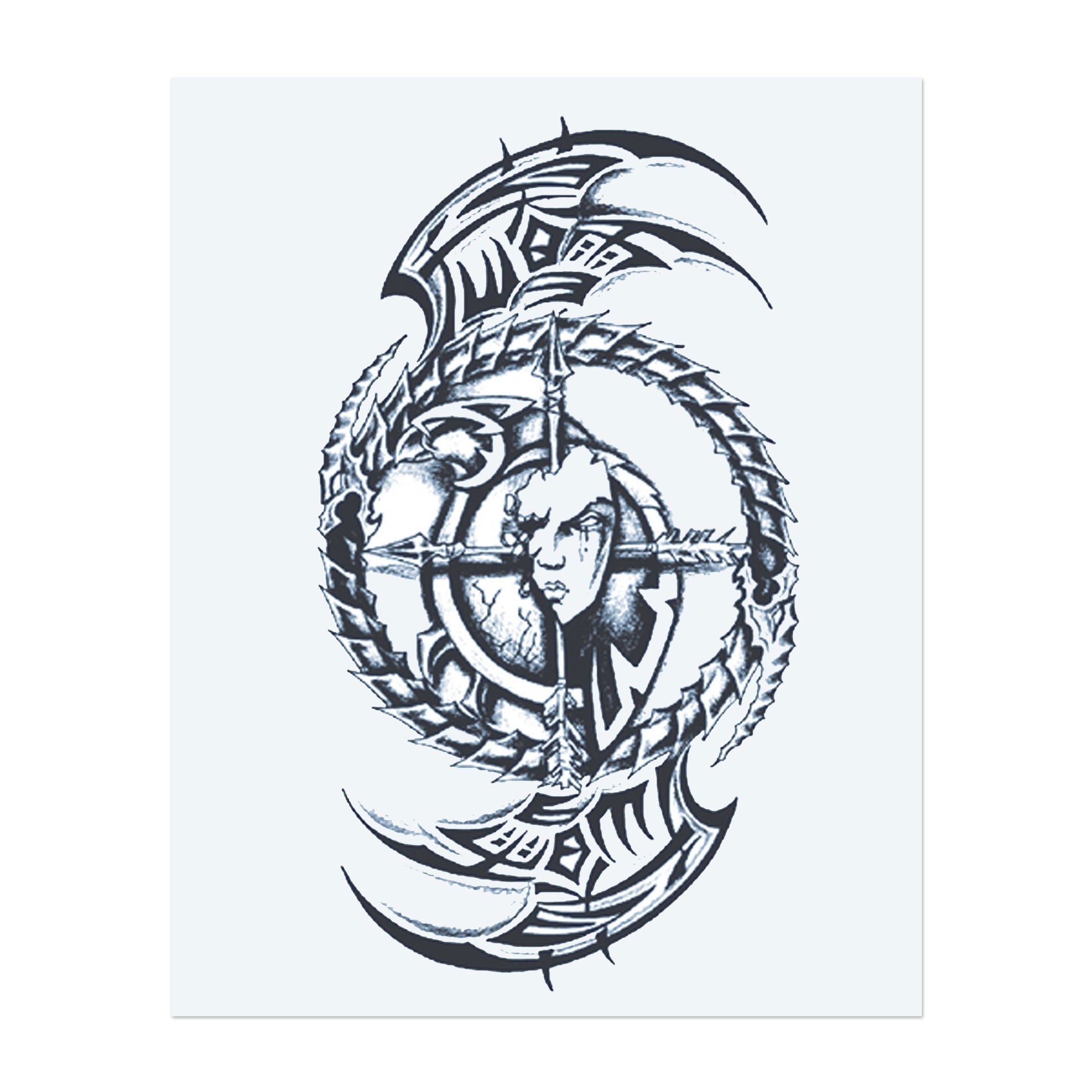Un tatuaggio dinamico con una figura centrale circondata da motivi tribali vorticosi. La croce e le linee nette rappresentano equilibrio e potenza, mentre la figura centrale aggiunge un senso di mistero e profondità. Perfetto per chi abbraccia sia la forza interiore che l'energia della trasformazione.