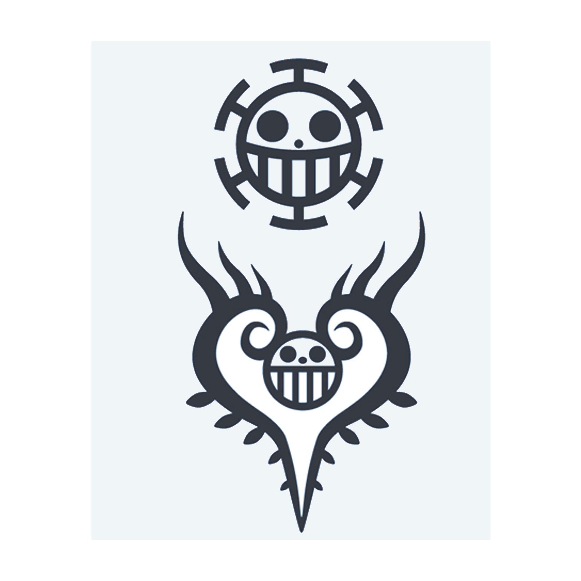 Un tatuaggio raffigurante il Jolly Roger di One Piece, con l'iconico teschio sorridente e le ossa incrociate. Il primo disegno è il simbolo dei Pirati di Cappello di Paglia, il secondo ha una cornice a forma di cuore. Un tributo perfetto per i fan dell'avventurosa ciurma di Rufy!