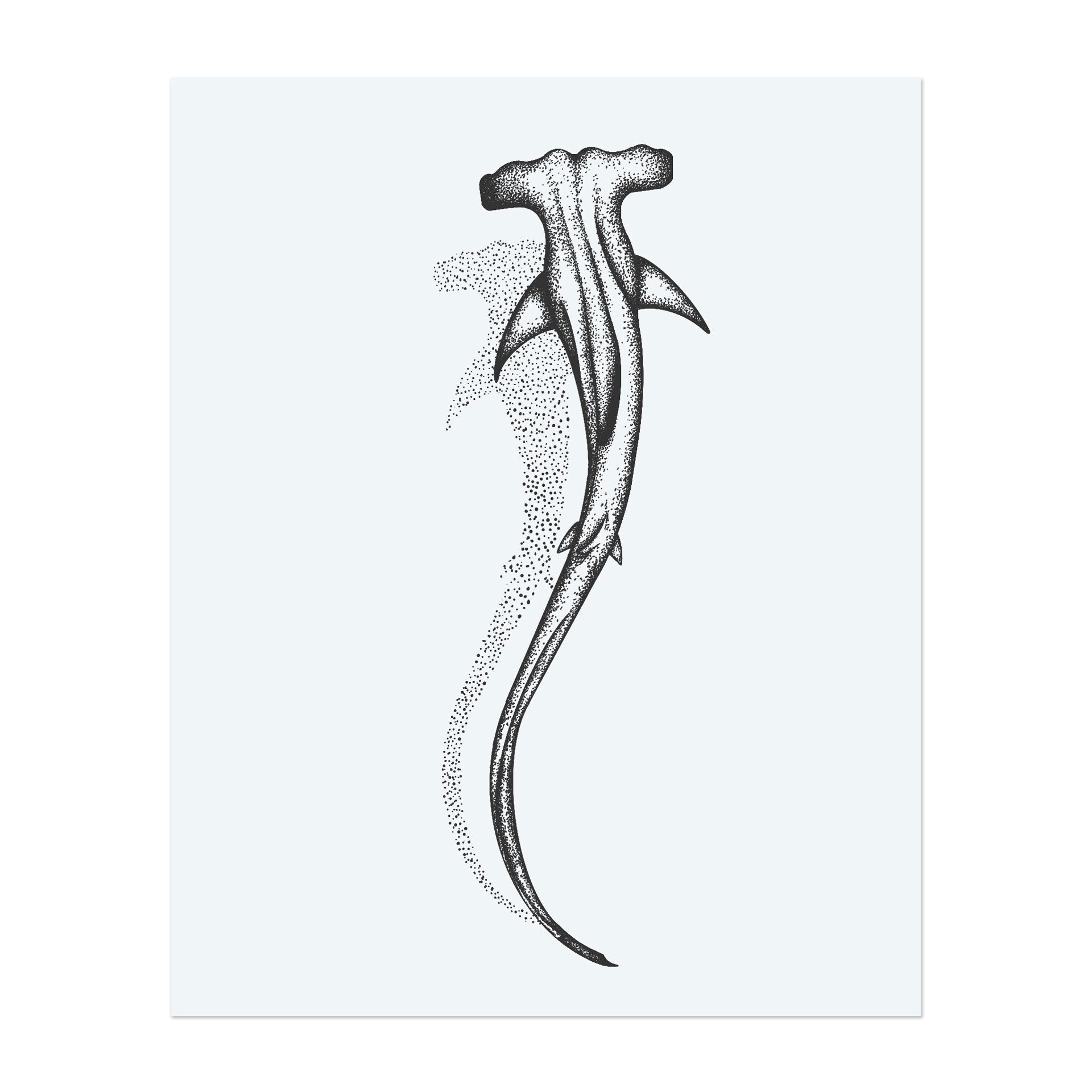 Un tatuaggio sorprendente raffigurante uno squalo martello stilizzato, disegnato con linee tratteggiate dettagliate. La forma dinamica e le ombre punteggiate conferiscono al disegno profondità, movimento e una misteriosa atmosfera marina.