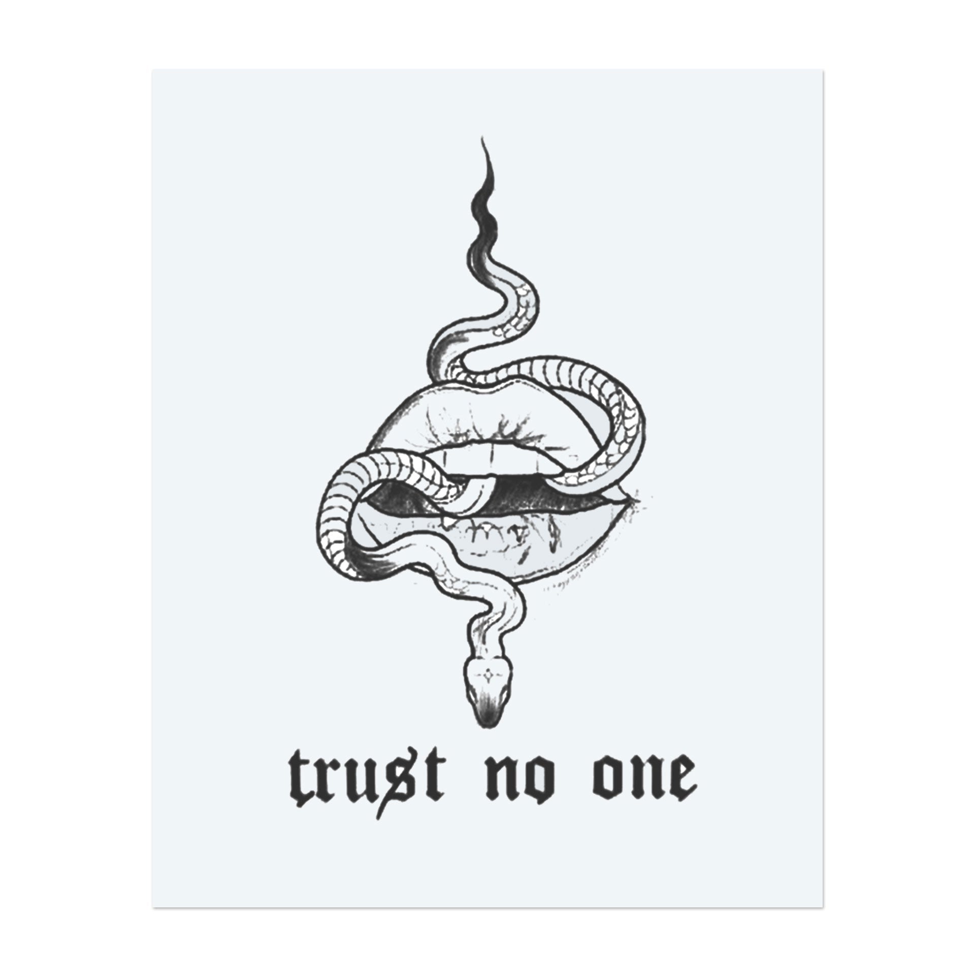 Un serpente arrotolato si insinua tra le labbra dischiuse, la sua silhouette seducente e minacciosa, con la frase "Trust no one" chiaramente visibile. Questo tatuaggio combina sensualità e pericolo, simboleggiando tradimento, cautela e le zanne nascoste dietro dolci parole.