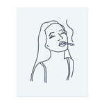 Un tatuaggio minimalista di una donna vestita casual che fuma una sigaretta. I suoi lunghi capelli svolazzano dolcemente e il fumo si diffonde nell'aria. Il disegno presenta linee pulite e semplici, che gli conferiscono un aspetto moderno e rilassato.