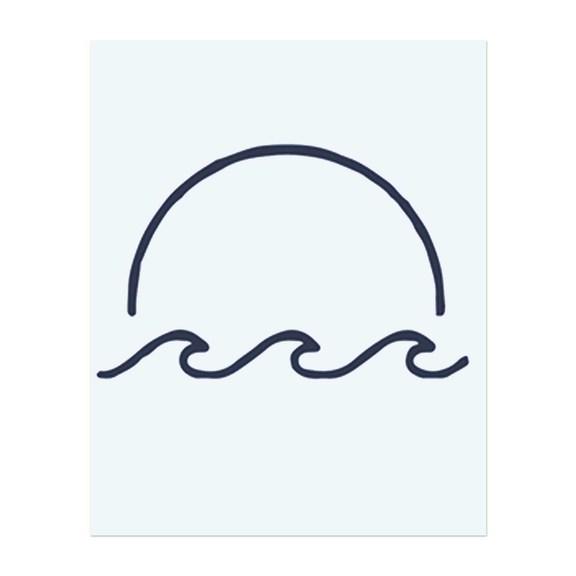 Un semplice disegno a tratteggio di un semicerchio su linee ondulate. Simboleggia un'alba sull'oceano, la pace o un legame con la natura.