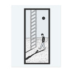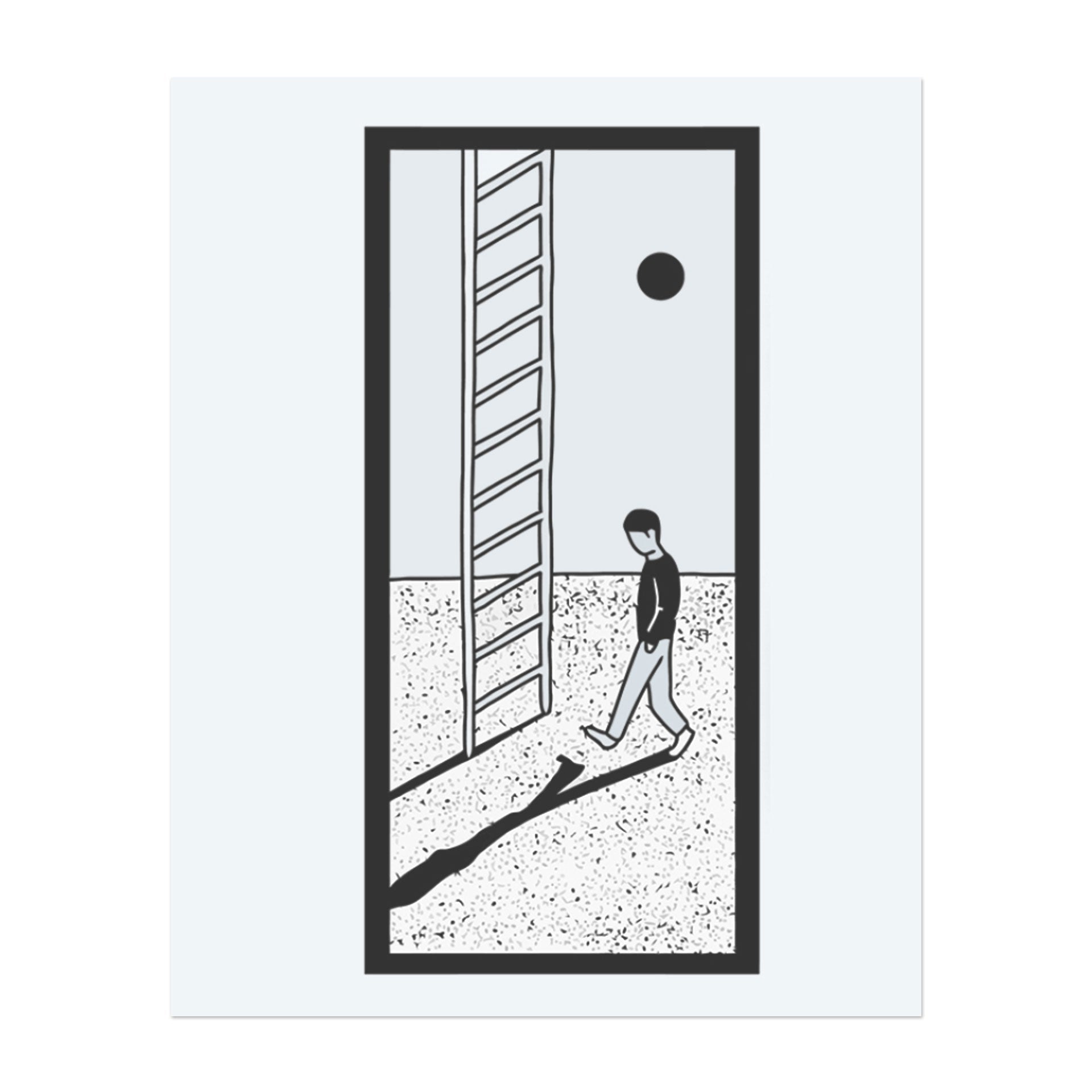 Questo tatuaggio raffigura una figura solitaria che cammina accanto a un'alta scala, proiettando una lunga ombra nel sole cupo. Con il suo minimalismo surreale, evoca occasioni mancate, introspezione e la silenziosa tensione tra scelta e destino.