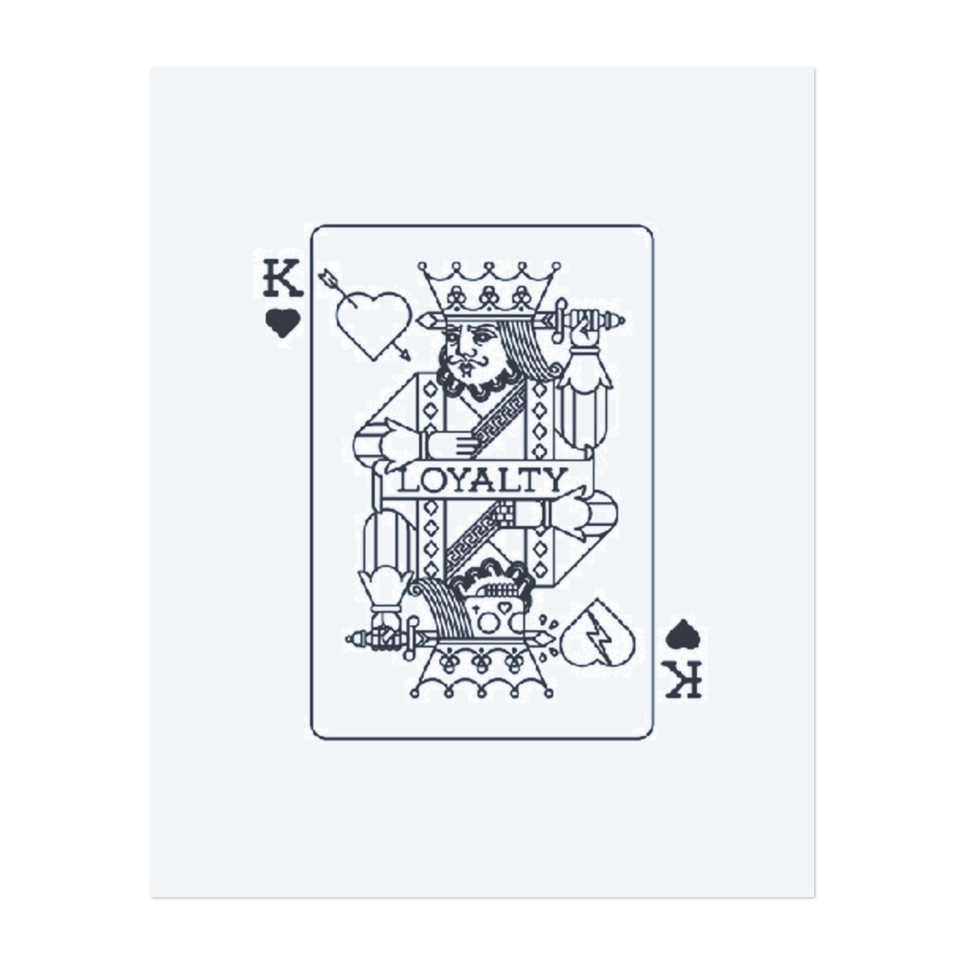 Una carta da gioco raffigurante un Re di Cuori con la scritta "LEALTÀ" sul petto. Il tatuaggio raffigura una figura regale con una spada, simbolo di forza e devozione. Rappresenta lealtà e onore, perfetto per chi apprezza queste qualità.