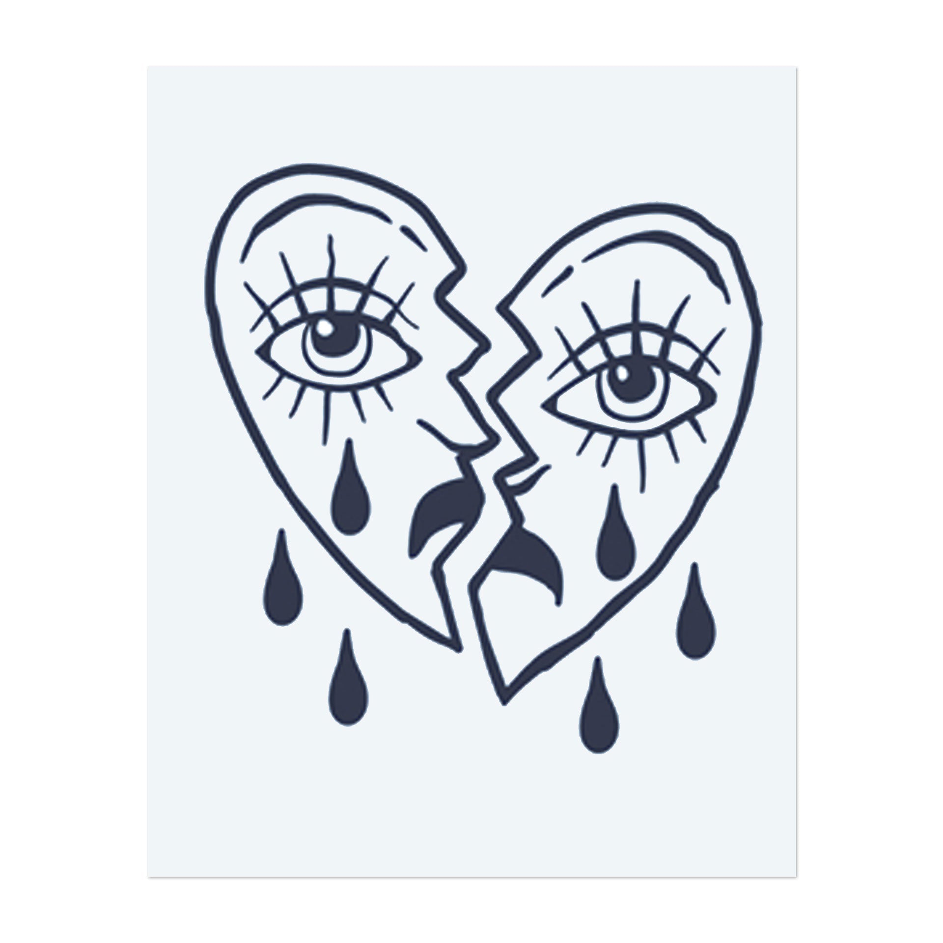 Un cuore spezzato con occhi e lacrime. Rappresenta il crepacuore, il dolore emotivo o uno stato di vulnerabilità. Un design sorprendente e carico di emozioni.