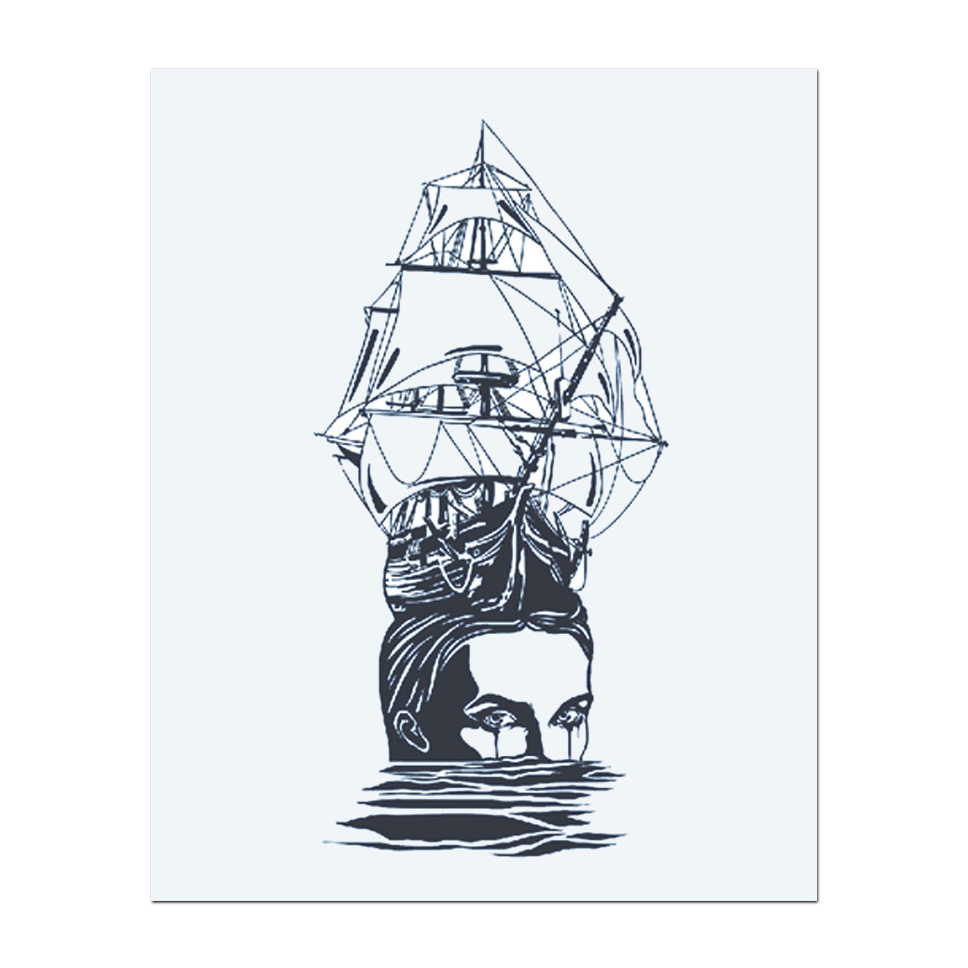 Una barca galleggia sulla testa di una persona, il cui sguardo è rivolto serenamente all'acqua. Questo tatuaggio dalla linea sottile rappresenta sogni, avventura e speranza, ricordandoti di andare avanti.