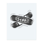 Due bende sovrapposte formano una "X" con la parola "SCAR" chiaramente visibile al centro. Questo tatuaggio temporaneo giocoso ma espressivo combina ombreggiature da fumetto con un audace messaggio di guarigione e forza attraverso l'imperfezione.