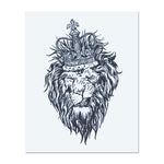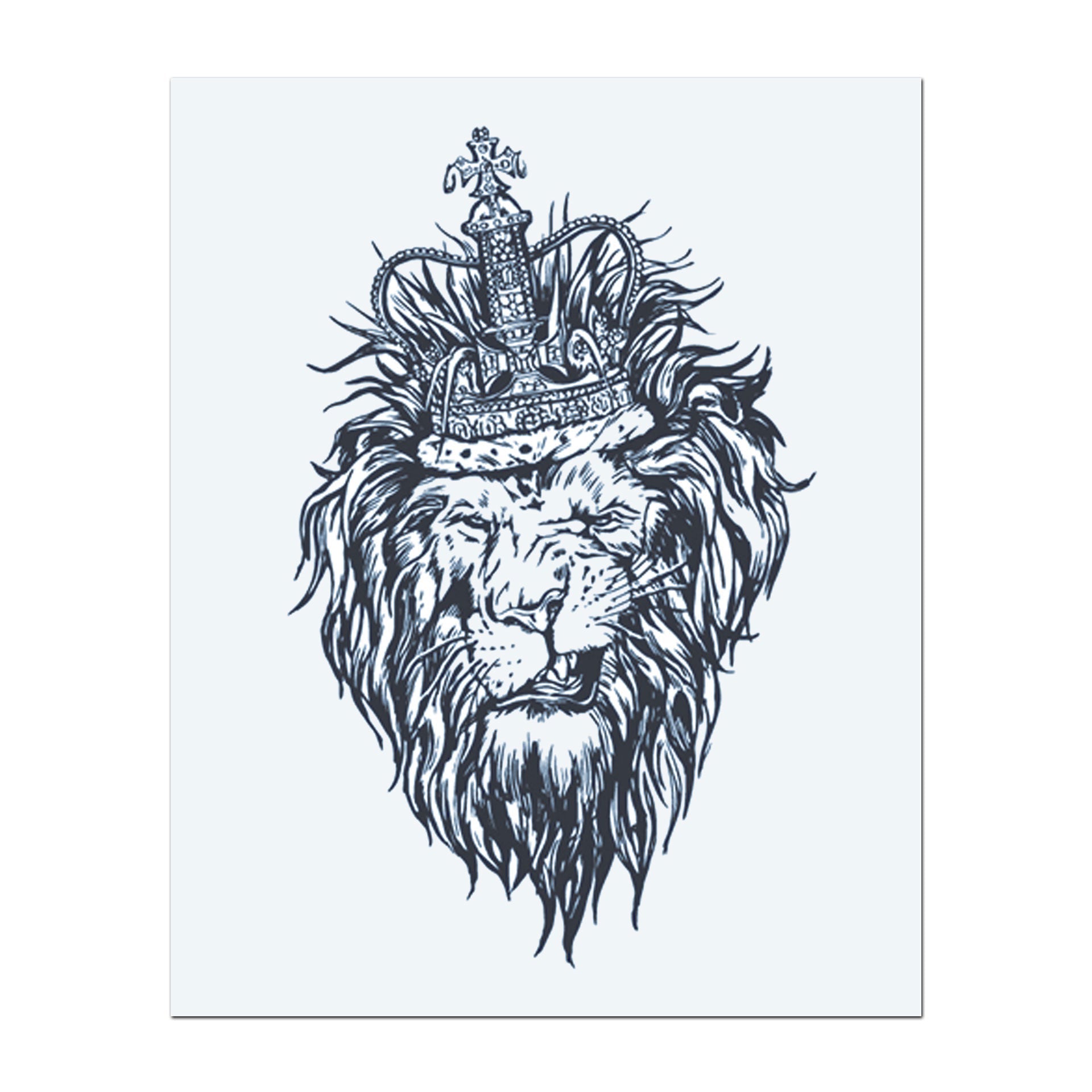 Un leone dettagliato, con un'alta corona reale, siede pacificamente con la criniera fluente. Questo tatuaggio realistico illustra forza, coraggio e potenza, ricordandoti di guidare con il cuore.