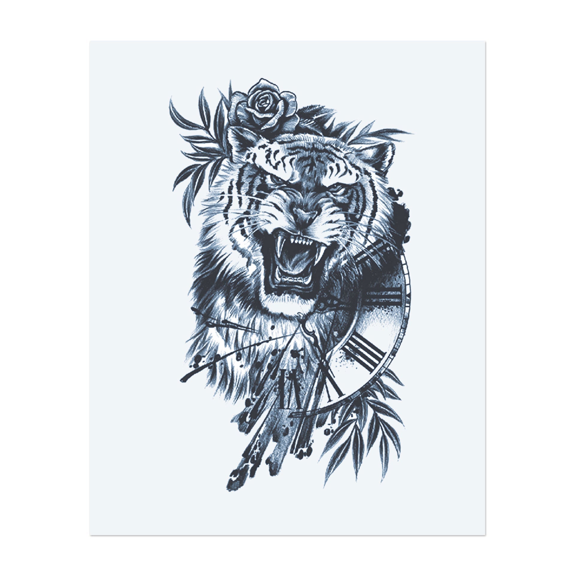 Una tigre ruggente con una rosa e delle foglie accanto a un orologio rotto. Questo tatuaggio realistico incarna forza, coraggio e audacia, ricordandoti che il tempo non può contenere la tua passione.