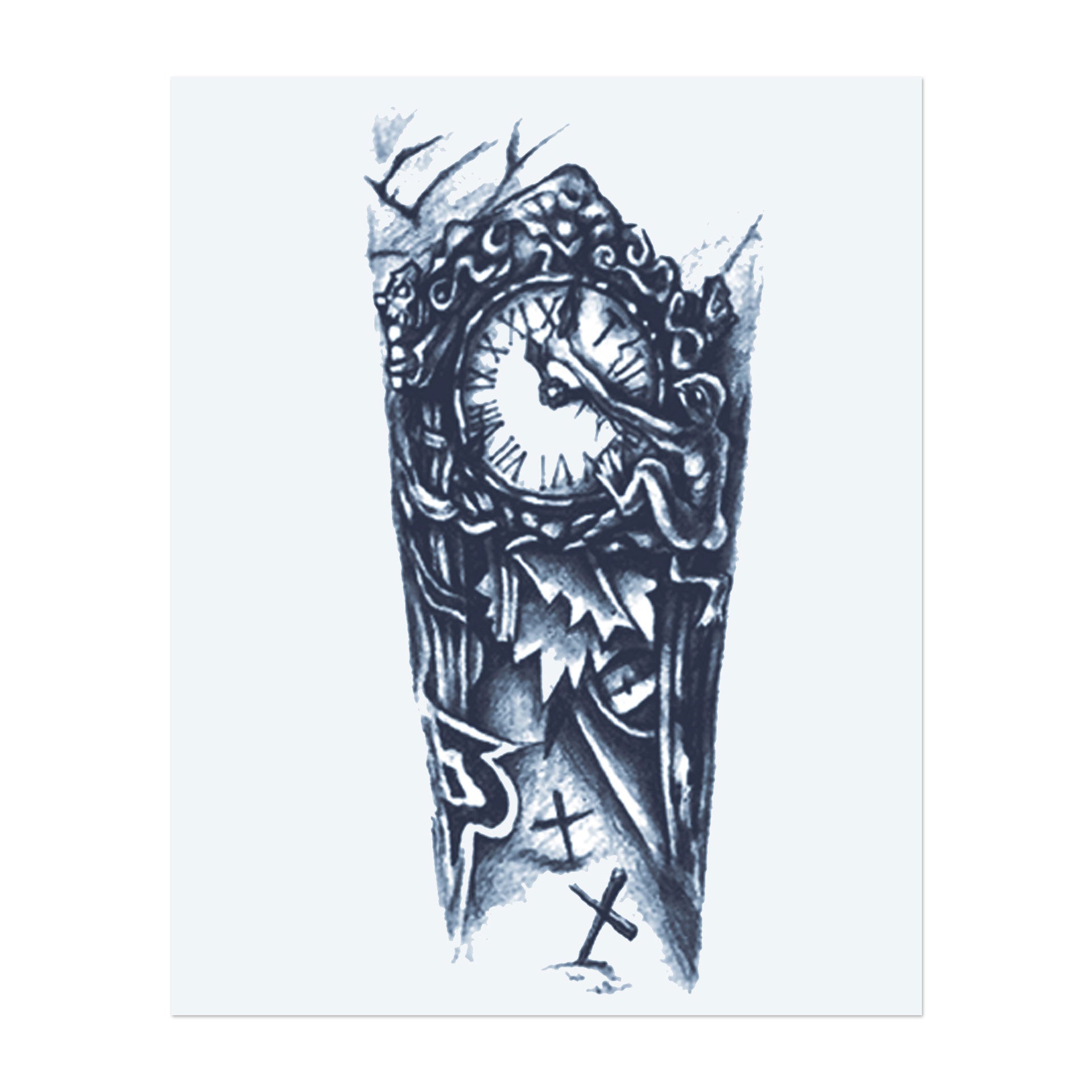 Un tatuaggio di un orologio rotto con numeri romani circondato da crepe e croci. Simboleggia il passare del tempo e l'idea che, una volta rotto, il tempo non può essere riparato. Un disegno significativo per chi riflette sulla caducità della vita.